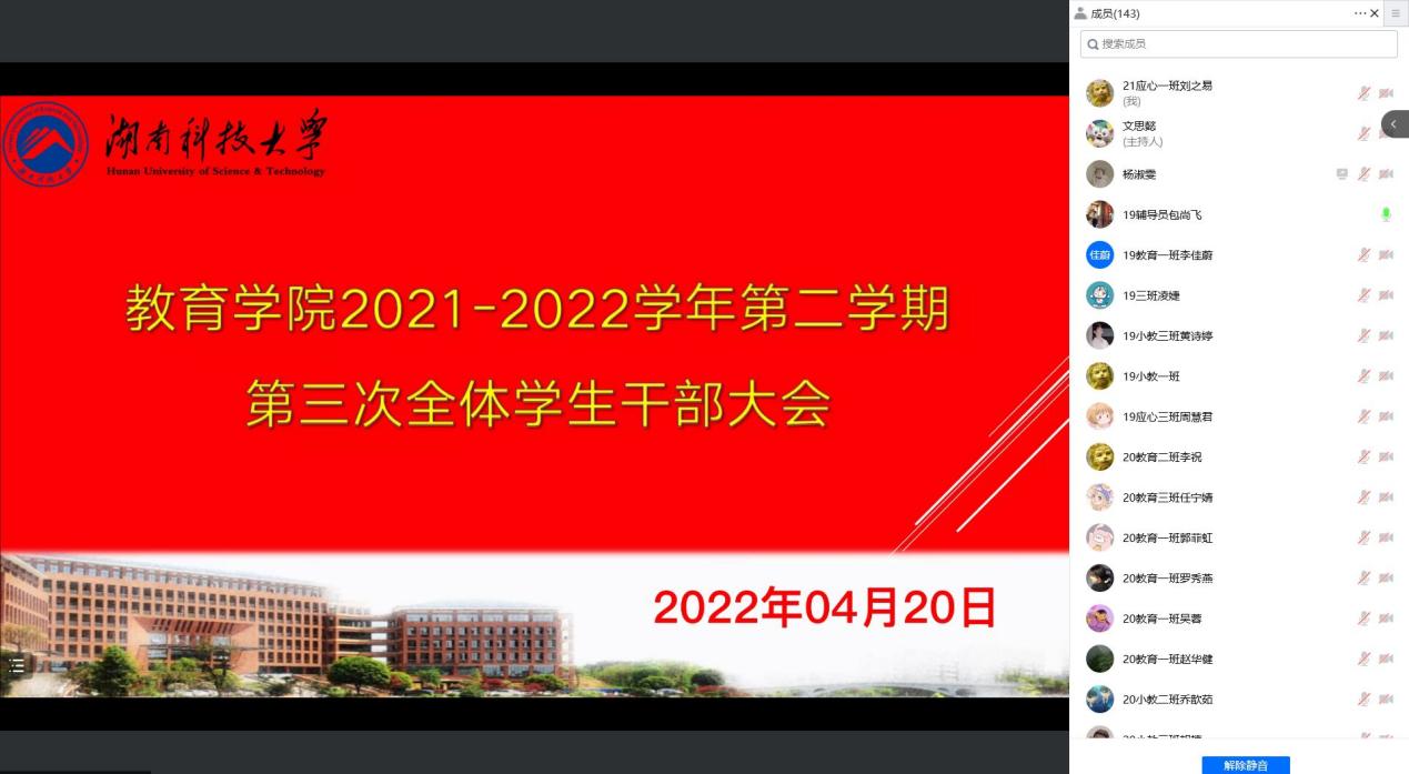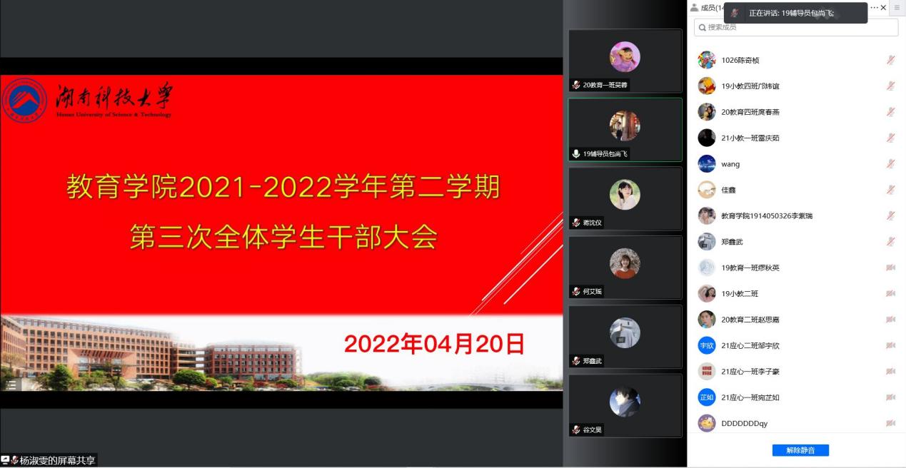为迎接教学礼拜周的到来,助力奋进科大建设,为我院学生营造良好的学风和校园文化环境,4月20日晚上21:00,yl88858永利集团学风建设大会暨第三次学生干部大会在线上顺利召开。学工办主任李涛,辅导员练素华、胡银华,兼职辅导员包尚飞出席本次会议。yl88858永利集团团委学生会副部及以上干部、党建会副部及以上干部、18-21四个年级的正副年级长、班长、团支书、19-21三个年级的学习委员、文体委员参加。会议由团委学生第一副书记田玺如主持。