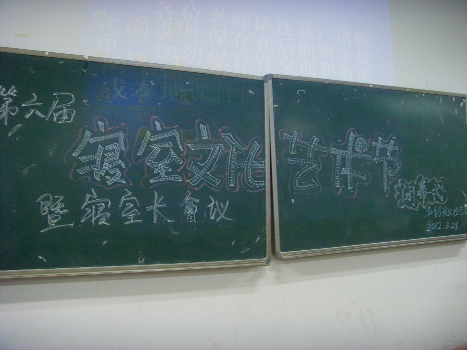 大会在纪检宿管部副部长韦文琼报告下开始。据悉,第六届寝室艺术节开始于2011年10月14日,截止到次月的21号作品上交,总历时36天,收集作品377件,上交到学校作品56件,获得校级奖励13项。其中,在手工艺品、征文、寝室标志、手抄报等方面均有不俗成绩。“新时代青年”、“挥洒热情,唱响青春”等标题鲜亮而醒目,彰显新一代大学生讴歌青春、展示自我的强烈愿望;寝室设计更是另一道亮丽的风景线,每个角落的设计无不充斥着“青春”、“活力”、“温馨”、“舒适”、“个性”的魅力。参与活动的同学们都大显身手,使出浑身解数给寝室披上了一件华丽的新衣 。