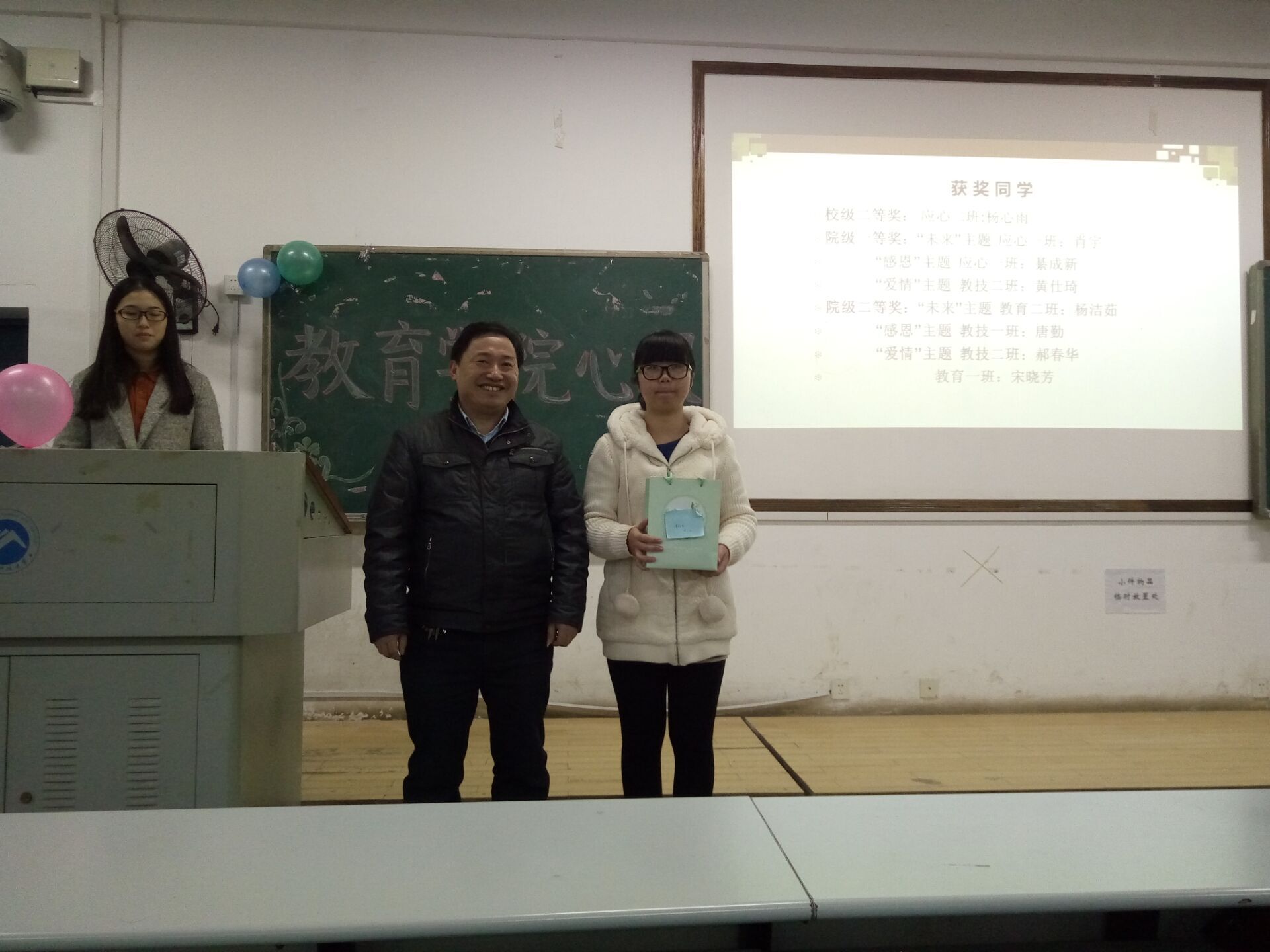 本次活动分为三个部分,首先是危机干预部副部长殷云洁向与会人员介绍心之语、心灵邮差活动、心理话剧活动。殷云洁先展示了心之语——以“感恩,爱情,未来”为主题的创作和三行情书的优秀作品,大批富有诗意的作品涌现出来,其中不乏对仗工整,词藻华美的佳作。教育技术学二班的黄仕琦同学所写的“我为你写下江山如画,你却让我蹉跎一生似水年华;我为你种下十里桃花,你却让我沐浴三年半城烟沙;我为你赋下凭栏相挂,你却让我等候四曲唱念做打……”,重章叠句,吟咏起来如歌曲般袅袅动听。应用心理学二班的杨心雨更是以其出色的写作功底,丰富的阅读积累荣获校级二等奖,向全校学子们展现教育学子的优秀文采。介绍了心灵邮差的成果,一共有300多封信,寄出了32封,并展示心理话剧表演精彩瞬间的照片,宣布了获奖班级名单。