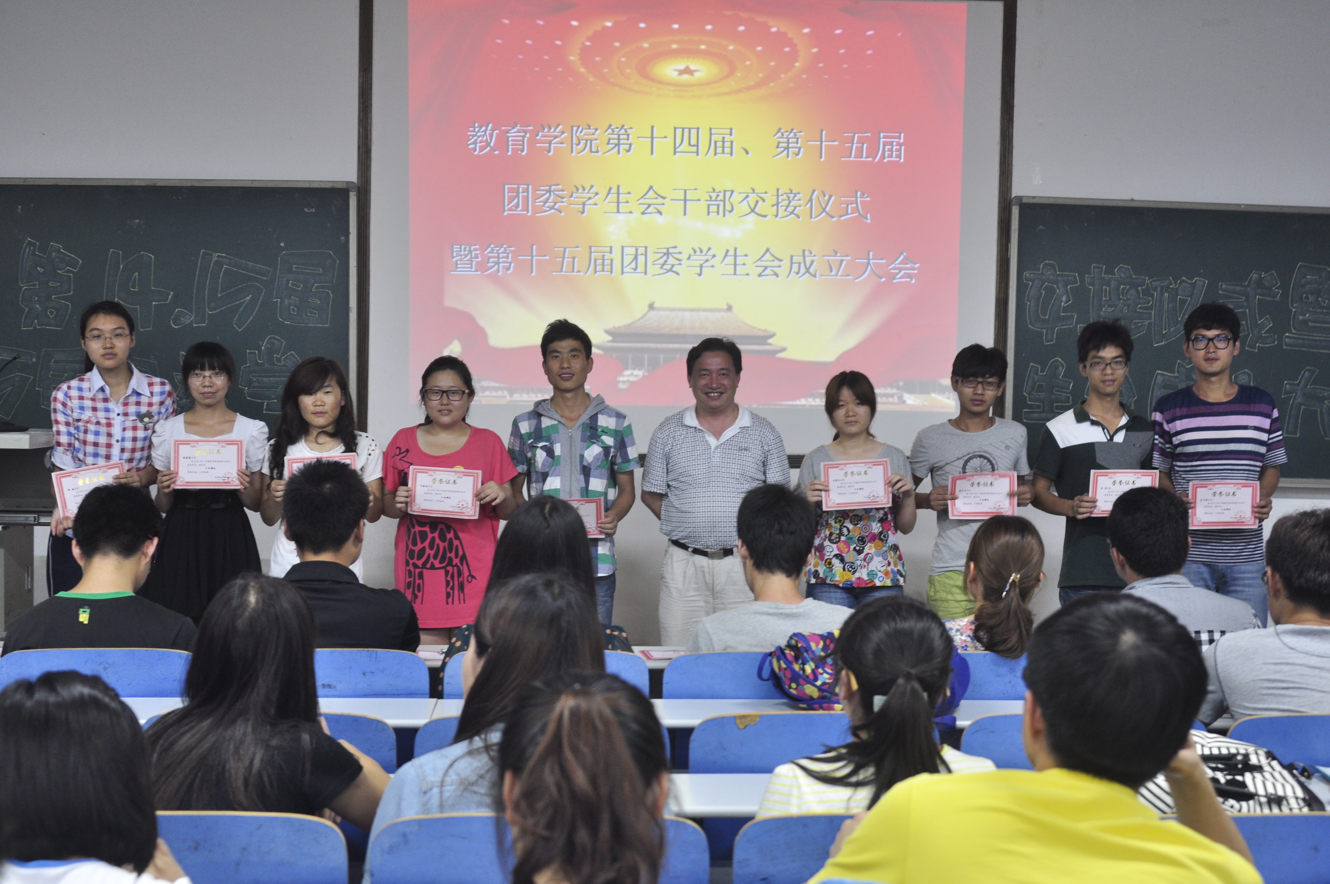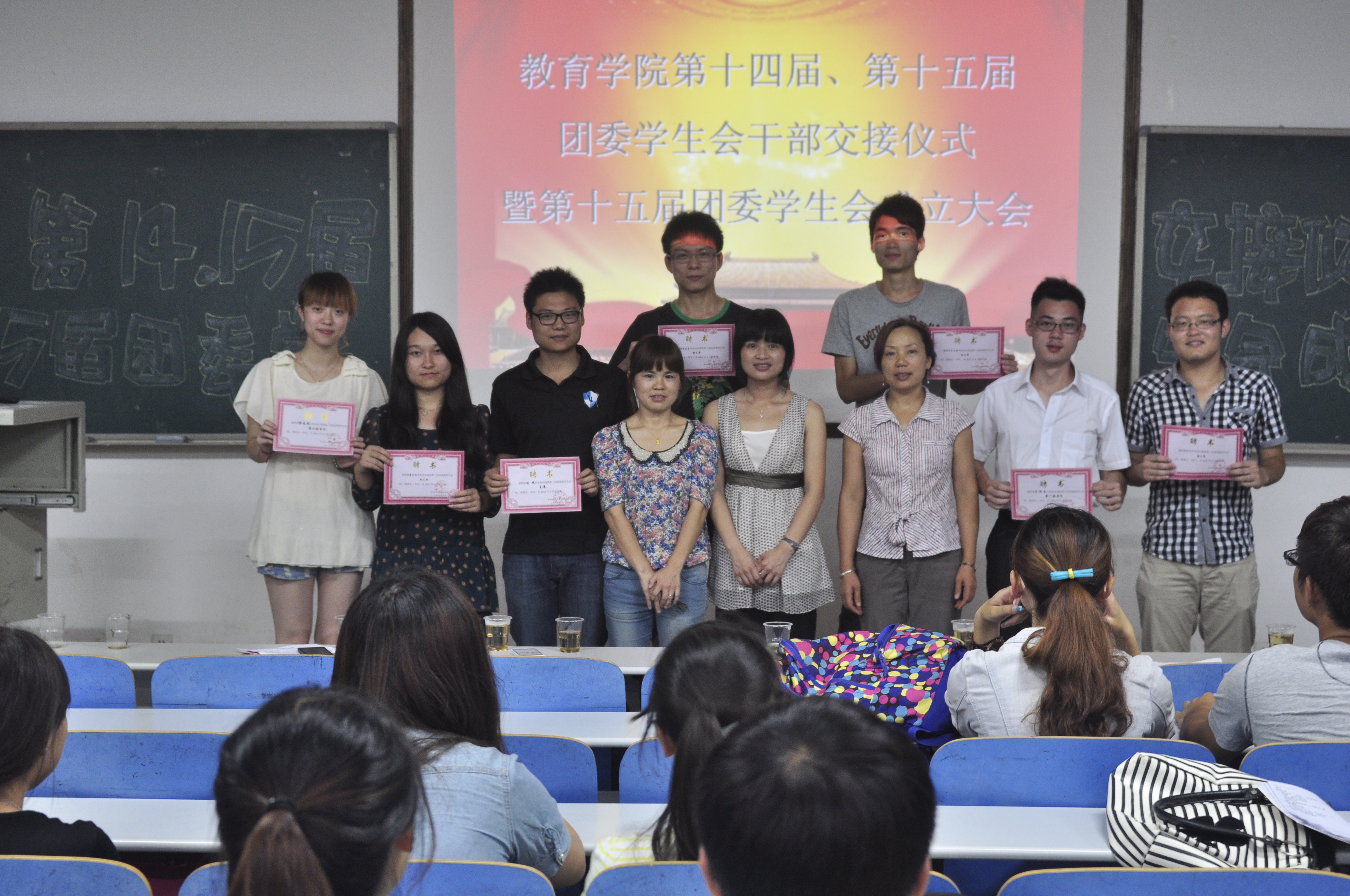 2013年6月8日19:00,yl88858永利集团第十四、十五届团委学生会干部交接仪式暨第15届团委学生成立大会于八教2-3召开。此次大会的嘉宾有,党委副书记王伟清教授、学工办辅导员胡银华老师、尹琼芳老师、练素华老师、兄弟学院团委学生会代表以及党建会代表。