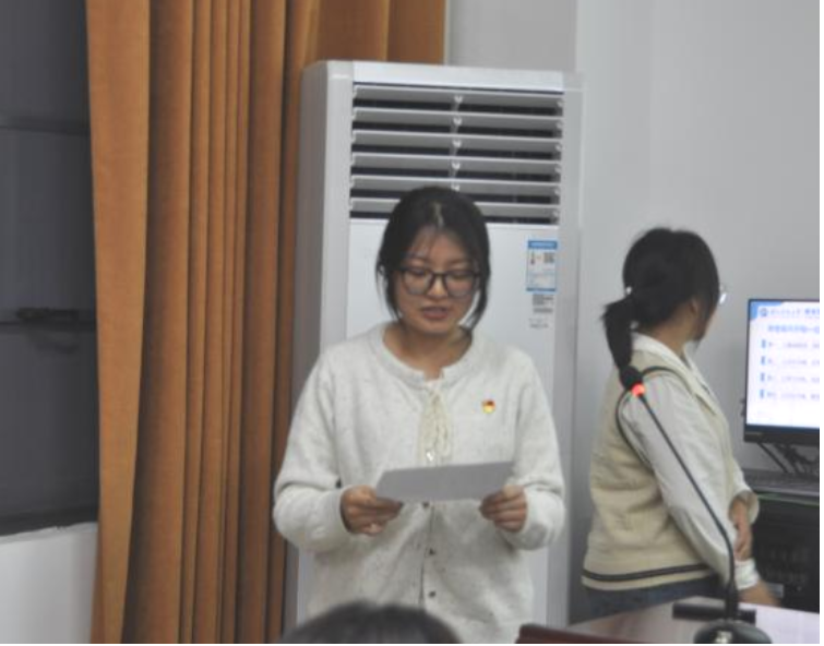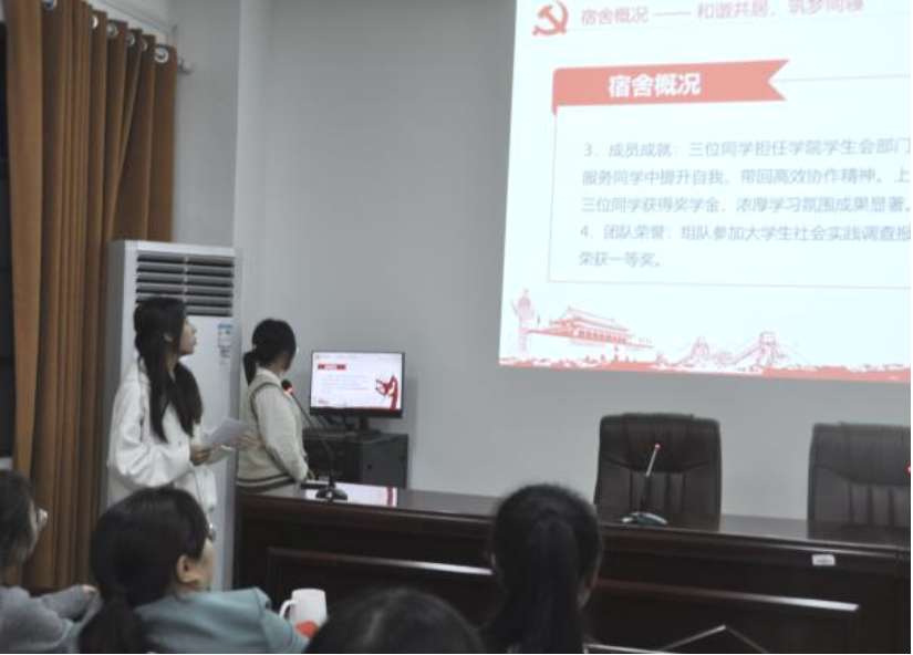 学生党员代表王晓晶、雷佳欣分享优秀宿舍文化建设心得。她们表示宿舍是第二家园,“党员宿舍”门牌时刻提醒自己牢记党员身份,将继续发扬优秀宿舍优良传统,以身作则建设好党员宿舍,由点带面促进整体精神文明建设。