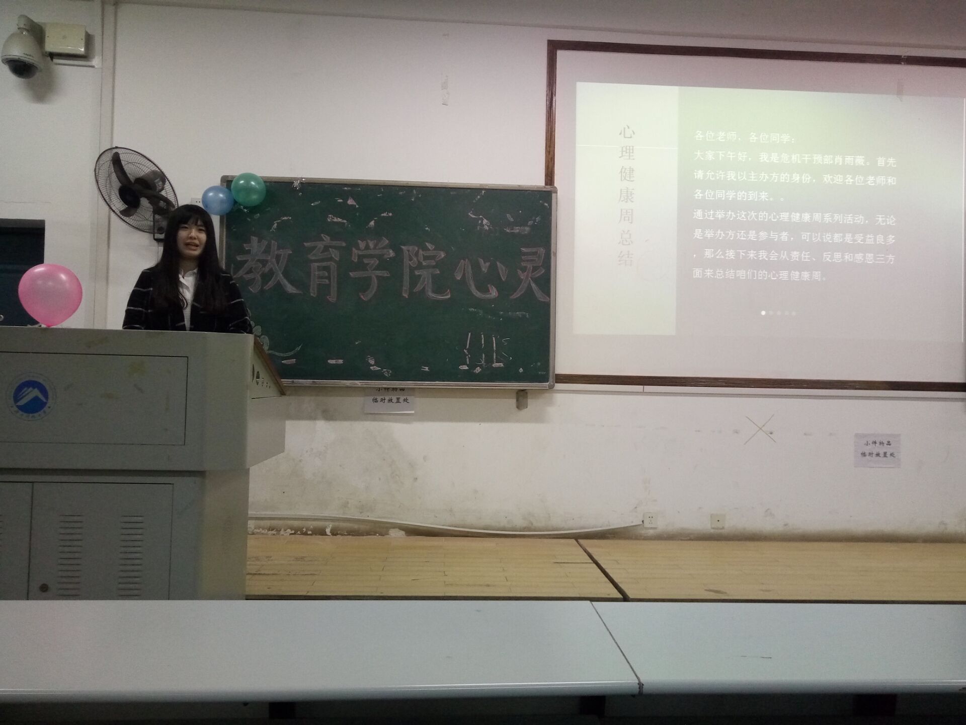 第二部分是危机干预部副部陈宁上台向众人介绍心理健康周的摆点、团体辅导活动、心愿漂流瓶活动的成果。心理健康周摆点活动在电信路口,许多同学都积极参与心理测试,活动受到一致好评。团体辅导活动由危机信息员组织,全班人员参与,各班都十分认真的举行了。心愿漂流瓶活动则是每个人在纸上写自己的心愿,危机干预部在容易实现的情况下随机选6位同学,实现他们的心愿,并在现场将礼品分发。