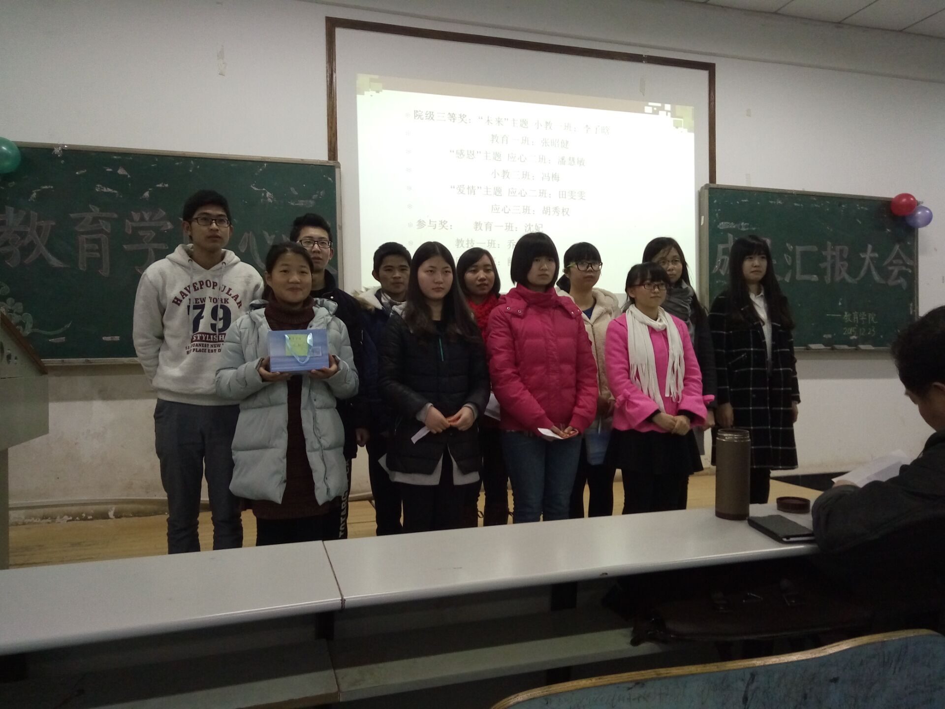 2015年12月23日16点yl88858永利集团于第八教学楼3-3教室举行yl88858永利集团心灵成果汇报大会,与会嘉宾有yl88858永利集团党委副书记王伟清,学工办辅导员老师练素华、胡银华、滕茜茜以及学生会副主席肖雨薇、杨柠遥、张丹。15级各班的代表皆悉到场。