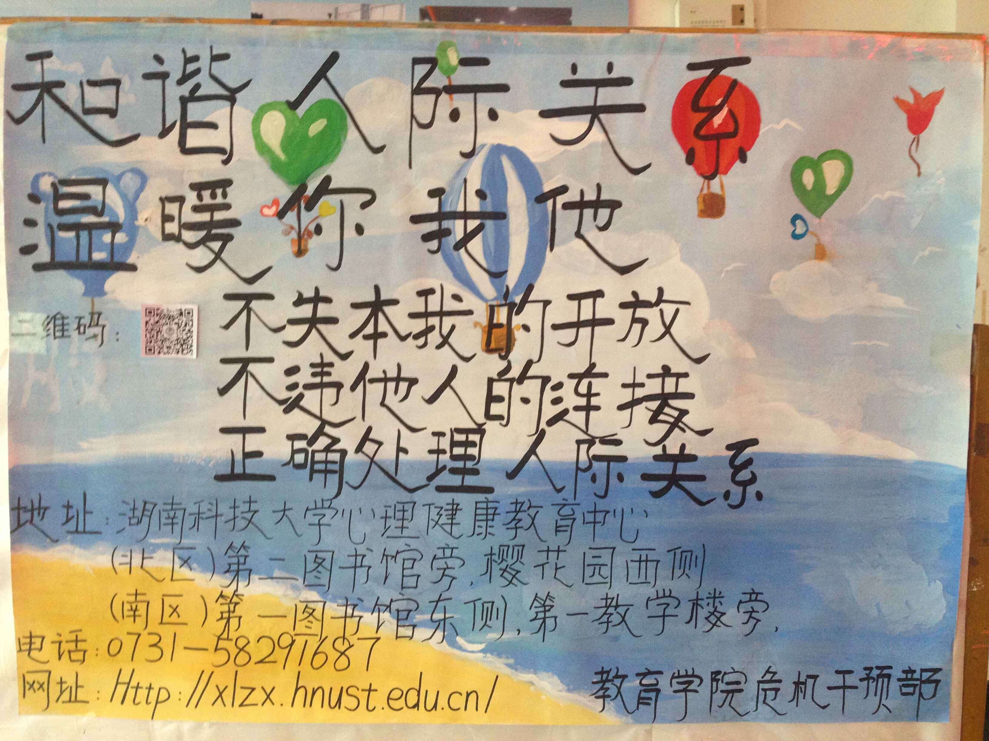 搞好人际关系是一门艺术。所有的人都需要不断的学习和实践、才能臻于娴熟。希望您能根据自己的具体情况,作一个自我分析 ,从而冲破自我封闭的篱笆,虚怀若谷,去建立一个和谐的人际关系。 yl88858永利集团危机干预部“和谐人际关系讲座”