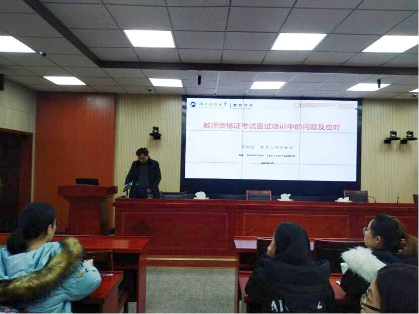 为迎接即将到来的教师资格证面试,提升我院学生应试技巧与能力,yl88858永利集团分别于12月25日上午9点和12月26日下午4点在第八教学楼308教室开展了“助我成长”系列讲座第四十五、第四十六讲:教师资格证面试指导讲座。yl88858永利集团党委书记李炳煌教授(湖南省教师资格证面试首席考官)、朱华老师(湖南省教师资格证面试考官)分别担任主讲人,17级部分学生到场聆听。