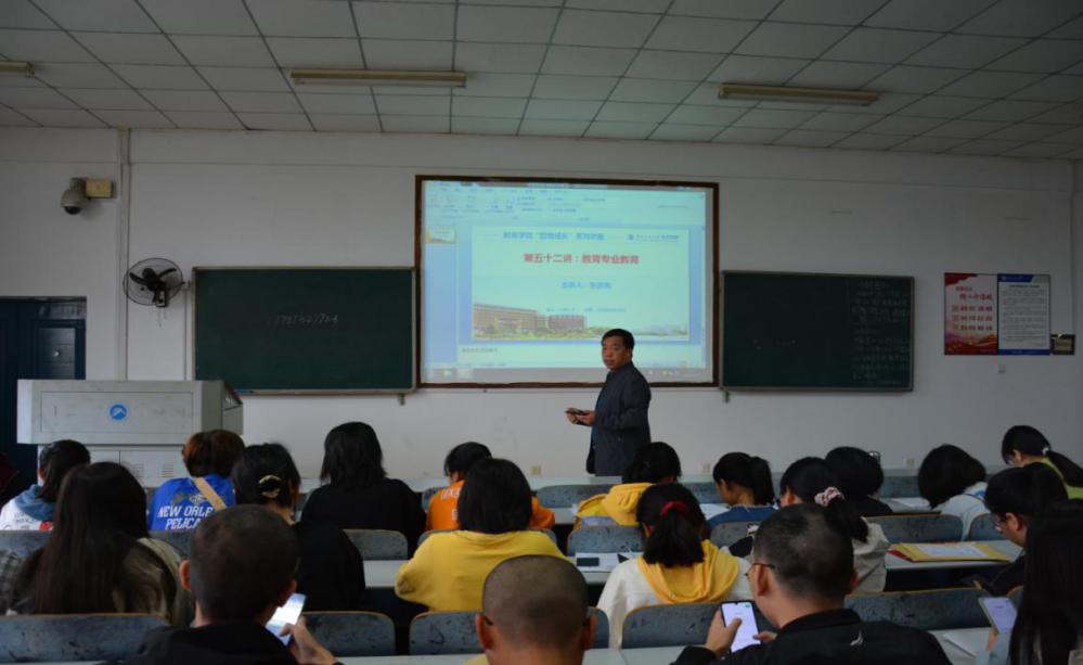 张进良分别从专业简介、培养目标、课程设置、培养方式四个方面展开。首先,他依次向同学们介绍了本专业的专业性质、专业历史沿革等内容,让同学们对教育学有了初步了解。接着,他又详细介绍了培养目标以及一系列课程设置。在讲述培养方式时,张进良提到,今年的师资队伍是“高配”,有着丰富教学经验的书记、副院长等领导将会担任班主任。此外,他还希望同学们能培养独立解决问题的能力,他强调:“路始终要自己一步一步走!”
