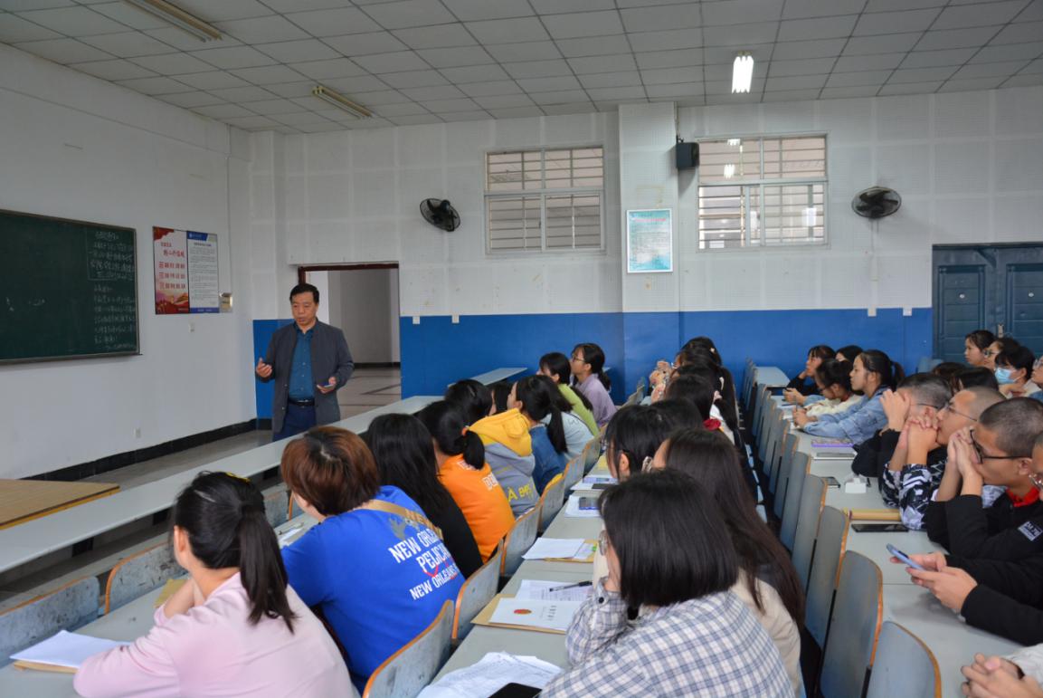 夏永庚则从新生关心的系情简介、专业介绍和师资队伍出发,对专业类的课程规划、培养目标、教学特色、专业优势、学生就业去向与前景进行细致入微的宣讲。对于小学教育专业,夏永庚表示学院将继续坚持“德能并重”的培养目标、“一体两翼”的培养模式和“三维协同”的培养过程,发挥好专业在师资力量、学科平台体系、服务地方效益方面的优势,助力学生提高教师专业信息化素养。夏永庚的介绍内容充实、语言生动幽默,激发起了新生们对即将开启的大学学习生活的向往与热情。同时,他提出新生要认清角色定位、明确求学目标,掌握大一做好专业准备、大二进入专业、大三专业深化、大四专业应用的学习方法。“青春是用来奋斗的,让我们一起努力奋斗再出发!”夏永庚温馨有力的寄语获得了新生们热烈的掌声回应。