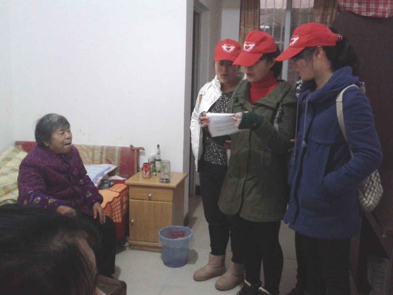 清晨的寒风不抵住这群“小红帽”的热情,队员们怀着诚挚之心,开始了各自的工作。听老人们讲过去的故事,大家了解到我们今天的幸福来之不易,同学们也把自己的故事及家乡的事情讲给老人们听, 他们一边和老人们谈心一边为老人锤背,之后在大家的鼓动下,拉开了与老人们的“歌曲互动”,队员们也为老人们打扫宿舍卫生,擦桌子、拖地、擦帘子等。屋外寒风呼呼,屋内暖意融融,活动在大家的欢声笑语中结束。