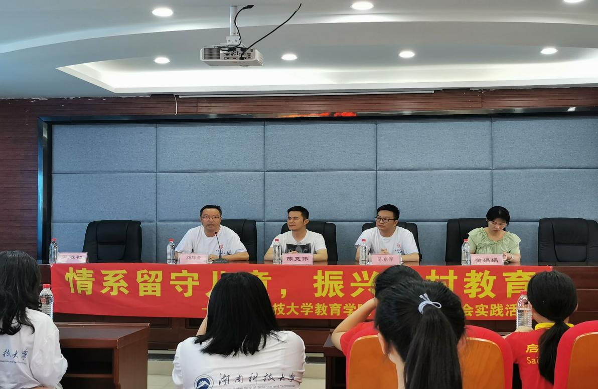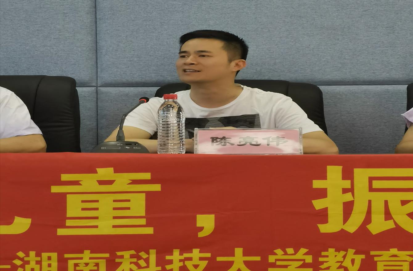 会议伊始,主持人尹运初简要介绍了这次支教活动的背景并表达了对所有来到启航学校的教员和老师的感谢和希望。他说木槿是南方常见的植物,生命力十分顽强,无论撒到哪儿都能开花,象征着一种坚韧的精神。他相信教员们也能像木槿花一样,在启航学校生根发芽,开花结果。会议第一项,由陈亮伟校长致欢迎词。他饱含深情地说,自己就是从大山走出来的,深刻的知道留守儿童求学的艰辛和无助,因此在大学时期他就通过自己创业来资助留守儿童,但是他却在这个过程中发现了乡村教育的痼疾,没有与外界资助相匹配的管理,也少有能够一以贯之的坚守,所以他在这些年中不断探索一条能够真正帮助到留守儿童的道路,而支教在其中发挥了极大的作用。暑期义务支教缓解了孩子们因暑假得不到合适的教育和看护的局面,给乡村的留守儿童带来的不仅是知识,还有温暖和爱。湖南科技大学与启航学校渊源深厚,科大艺术学院四年来坚持不懈的支教,培养出了一支登上春晚舞台的合唱队伍,让大众重新认识了留守儿童这个群体。“关爱留守儿童,振兴乡村教育”在这个暑期,湖南科技大学木槿支教团与启航学校携手同行,共同努力,推动乡村教育大步向前。