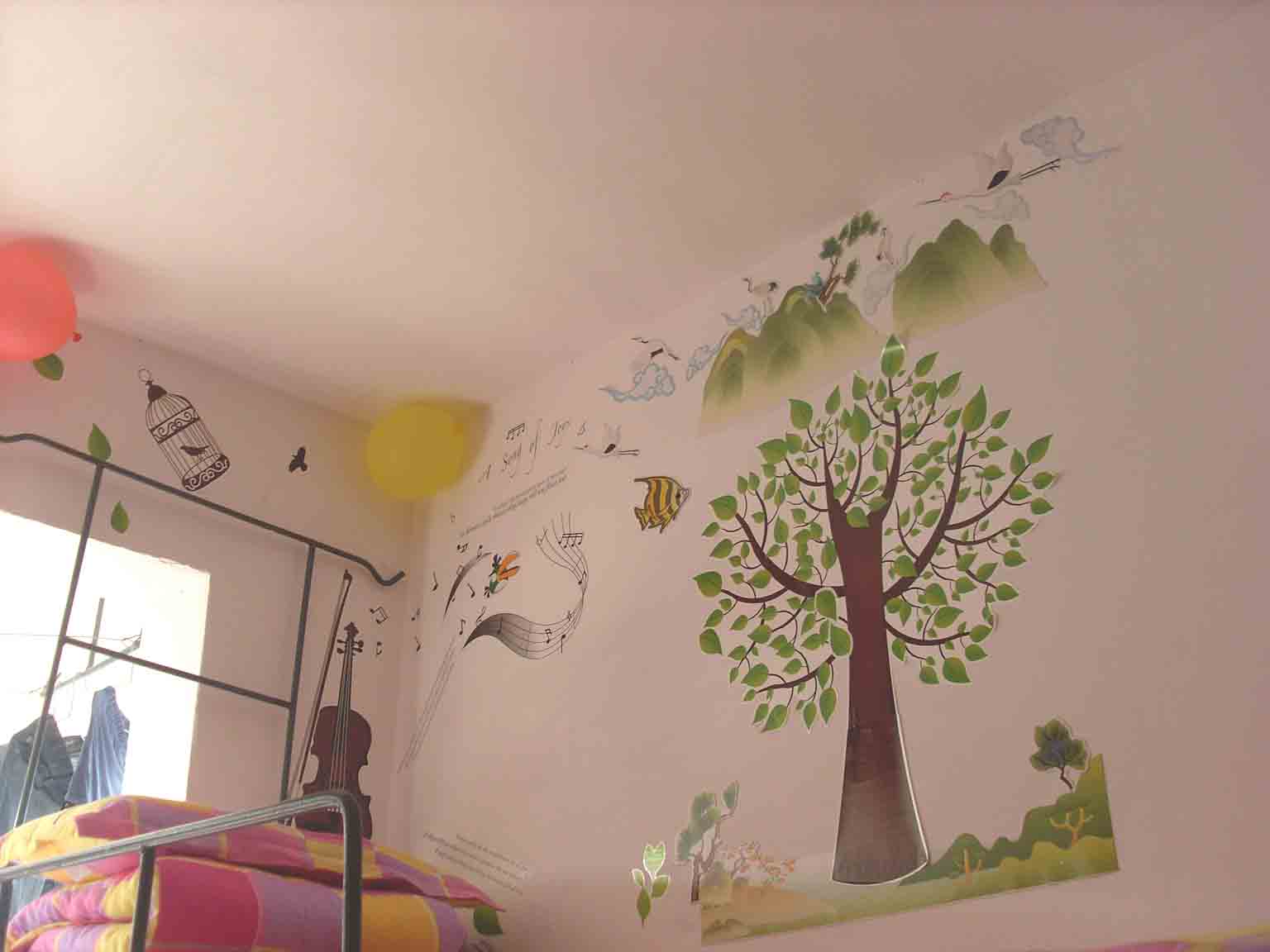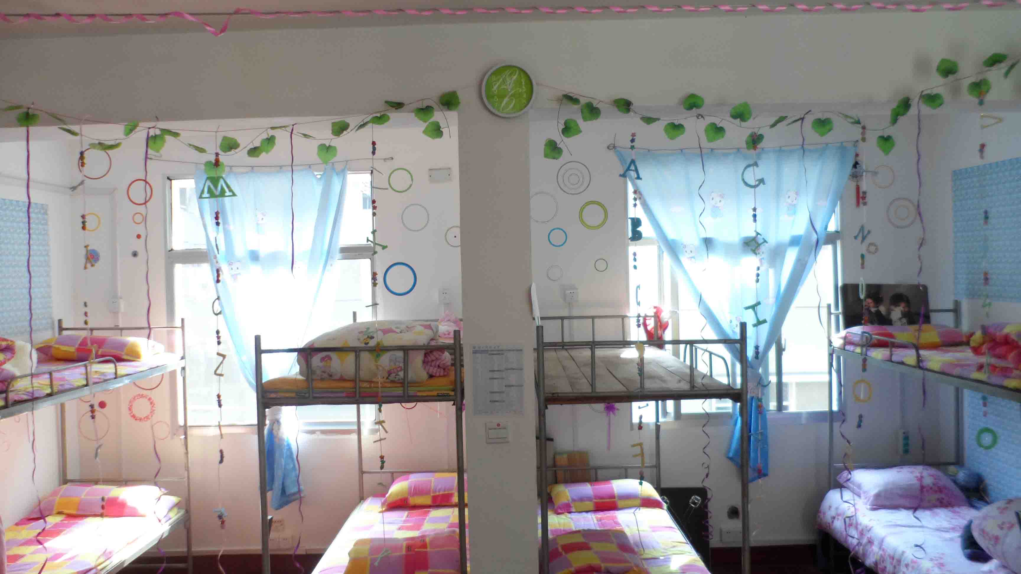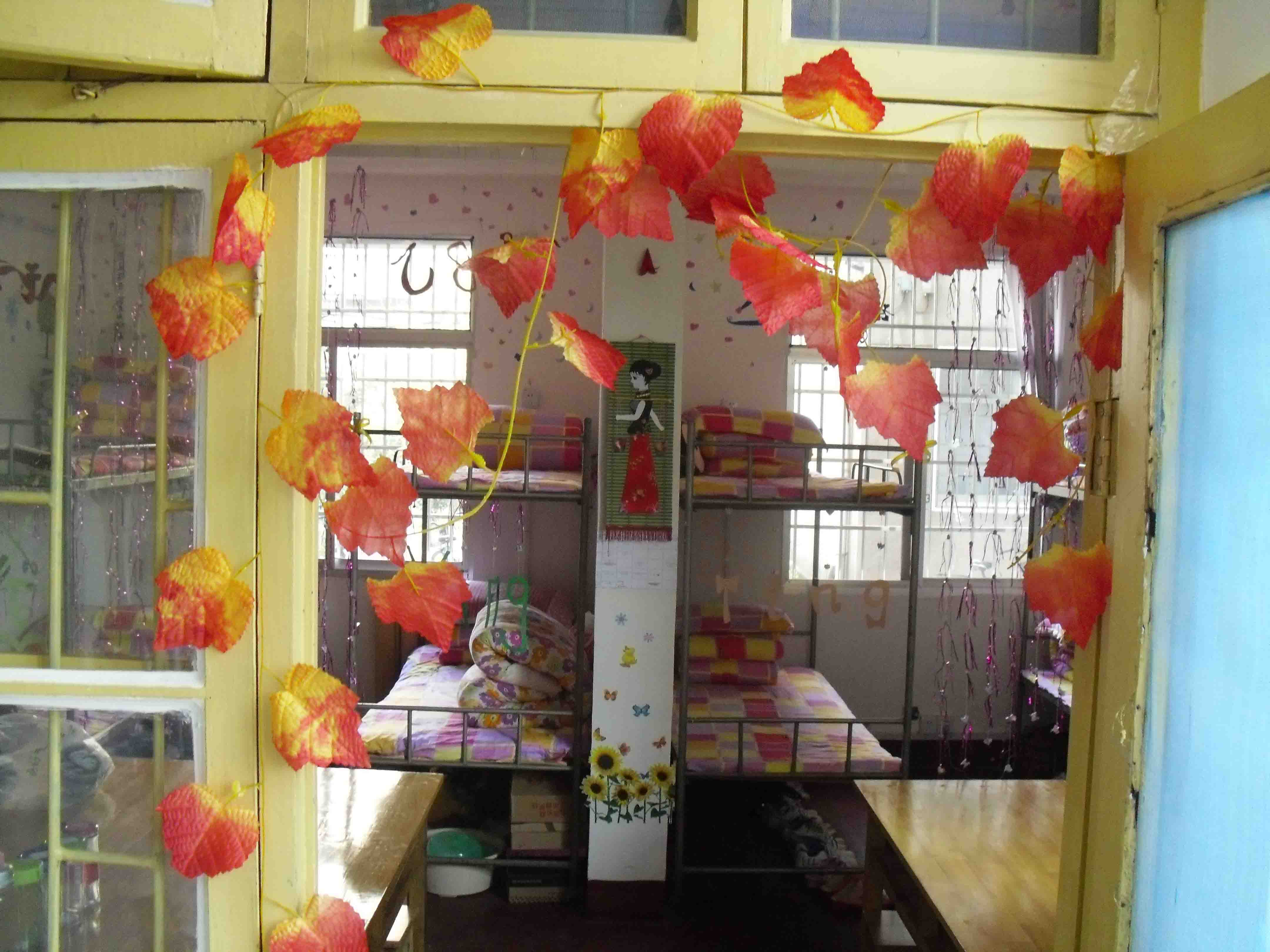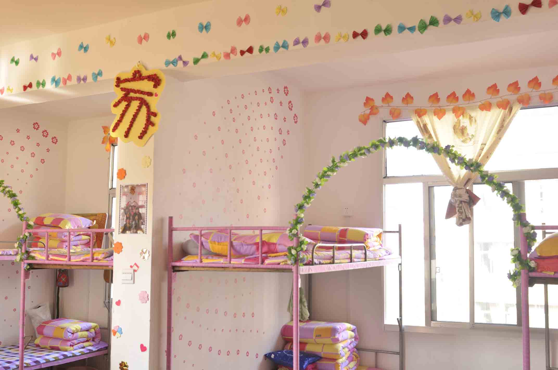 用笔画出的温馨的家,窗户上可爱的卡通人物,纸上两条栩栩如生的金鱼,富有生动表情的气球等各种特色手工制品在“八宝屋”、“春风物语”、 “好吧”、“自然堂”、“逍遥阁”等女生宿舍中层出不穷。用纸折花,折星星,折纸鹤;将纸剪成想要的形状:星星,月亮,卡通人物;画出寝室成员的漫画像;制作精美的课表;挂着梦幻气息的帘子;彰显青春活力的照片;用名字缩写组成的画等无不体现了女生们的心灵手巧。