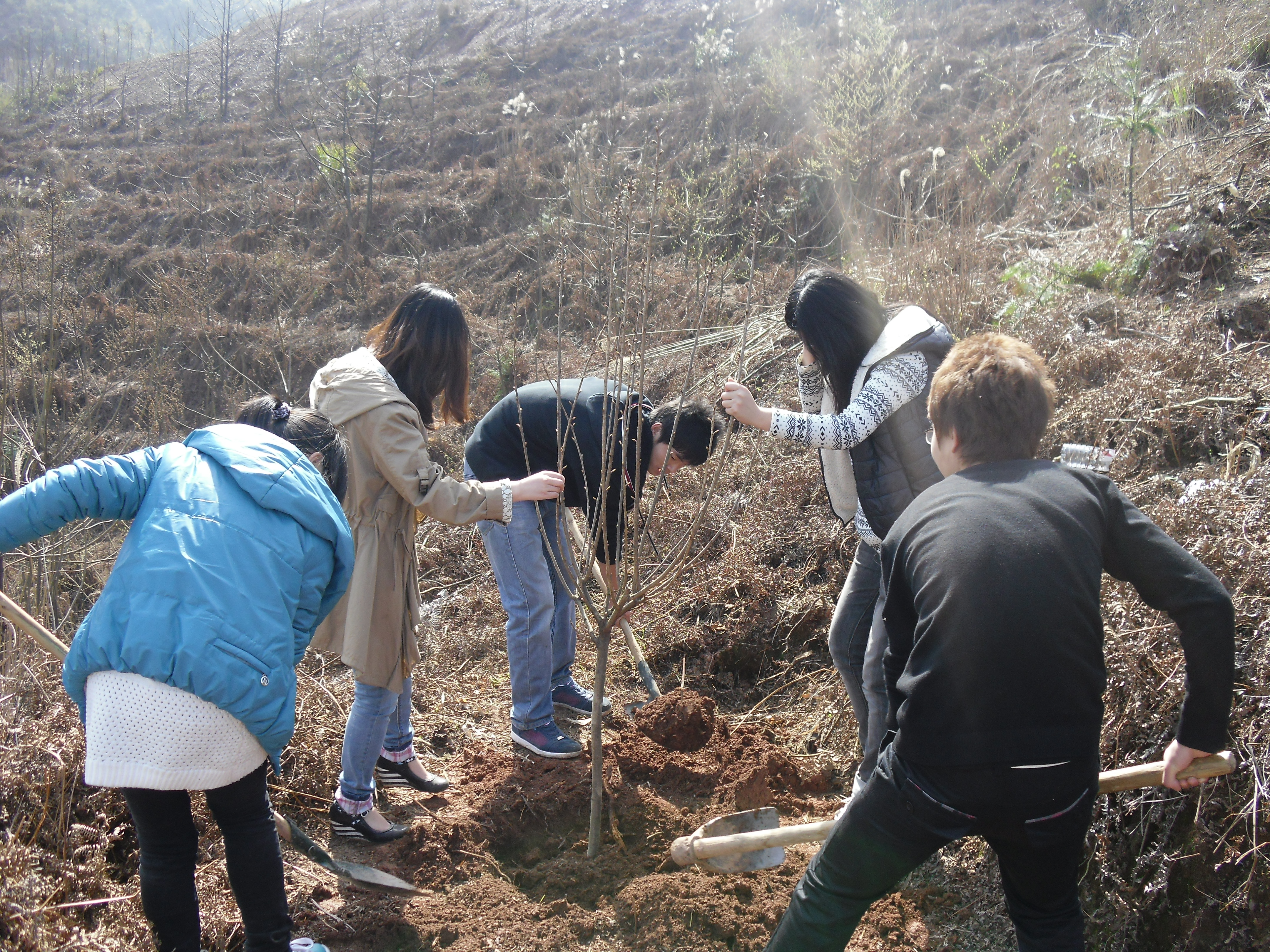 天公作美,春光明媚。灿烂的阳光固然为树苗的生长提供了气候的优势,但对于辛苦植树的同学们来说,却格外显得炙热。“啊,太快乐了!这是我人生中所种的第一棵树,第二排第六棵,我一定会好好记住的,等它长大了,我会再回来看它的。”王珍高兴的呼喊道,“快走,快走,我们再多拿些树苗去种,不然就都被别人种光了。”顾不得擦拭脸上的汗水,她拉着队友就去找树苗。