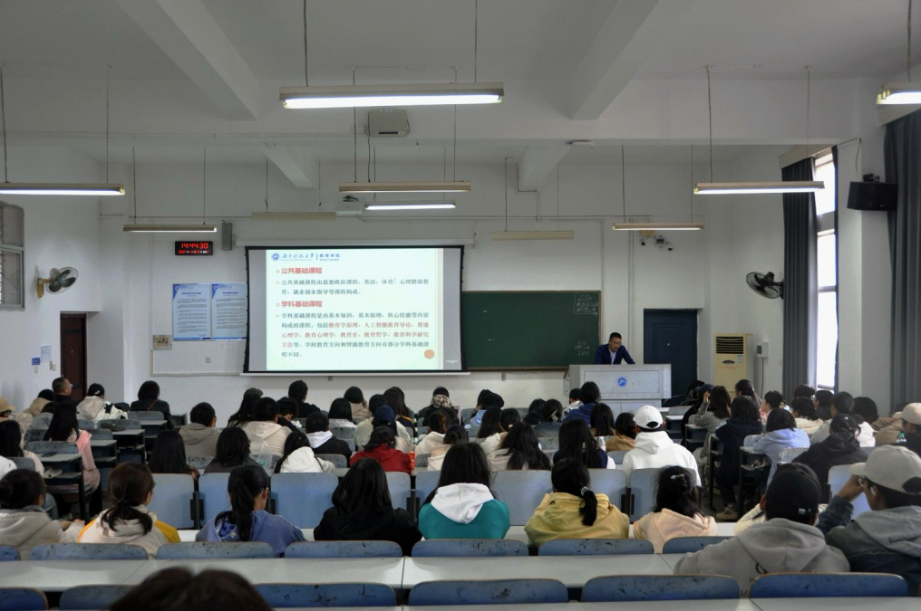谭千保阐述了我院的师资力量和办学条件,并针对师范类专业的学习内容、学习方法与就业方向等问题进行了深入剖析。随后,刘斌和唐汉琦全面介绍了专业培养方案、课程设置和培养目标等内容。