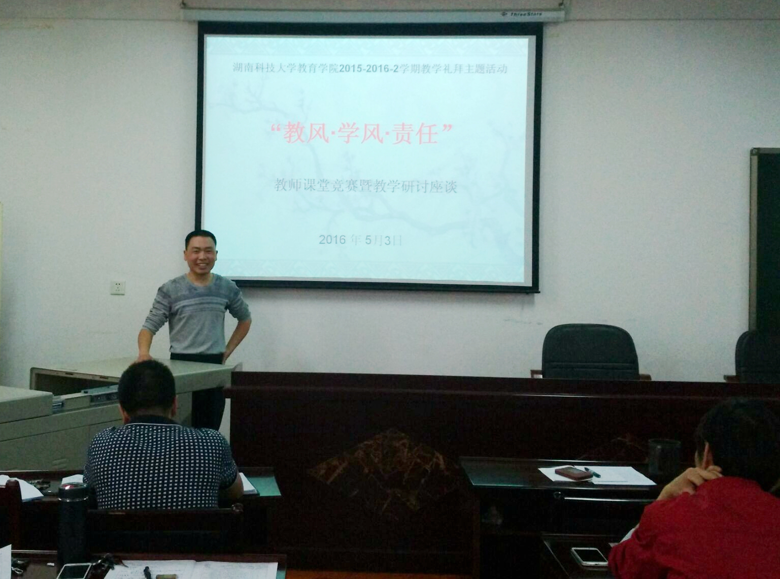 本次大赛基本按照省教育厅首届教师课堂竞赛规则进行,旨在更好地促进教师之间的交流和学习。每位教师提前准备1课时的教学设计和授课课件,并分别进行15分钟的课堂展示,王贤文、张晓报、刘旭、夏永庚等四位教师先后对自己的课程教学进行了展示。王贤文老师主要介绍了ppt强大的交互功能,并逐个演示超链接、触发器等制作及其于教学课件的完美结合方法;张晓报老师由《论语》中的经典引出“学习迁移”这一主题,并通过生动的实例介绍学习迁移的内涵以及分类,给我们以很大的启发;刘旭老师主要为我们讲述了《普通心理学》中的“知觉”的概念,并对我们日常生活中的反应进行科学分析,在场的老师都很投入;夏永庚老师则带我们重回两宋时期,领略了闻名至今的六大书院,并介绍两宋时期的教育概况,其生动的讲解让我们仿佛穿越至充满书卷气息的两宋书院。