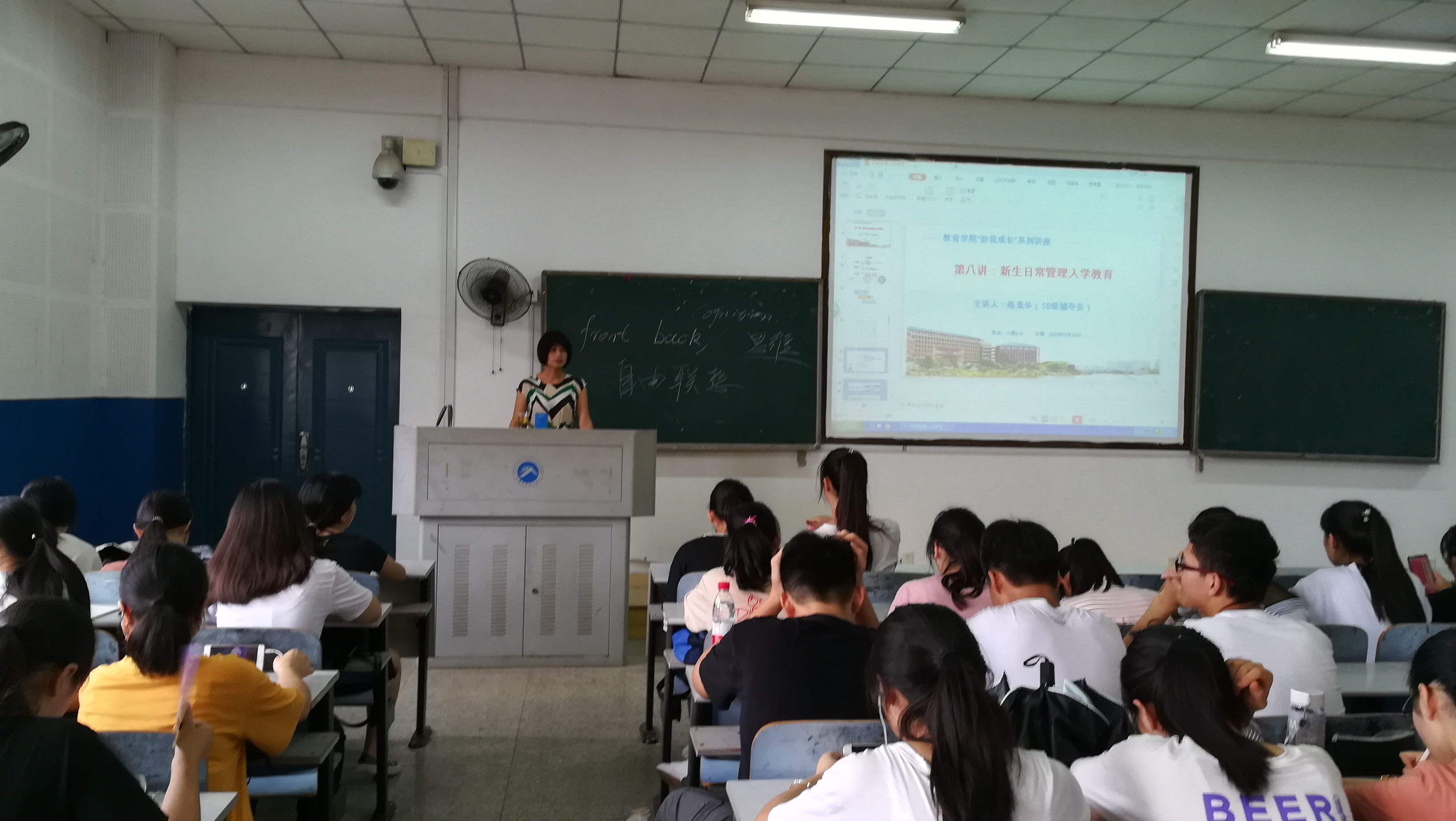 为使2018级新生能更好地适应大学生活,明确校纪校规,时刻注意自身安全。2018年9月18日14:30,“助我成长”第八讲:新生日常管理入学教育在第八教学楼3—3顺利召开。本次主讲人由18级辅导员练素华老师担任,全体18级新生参与会议。