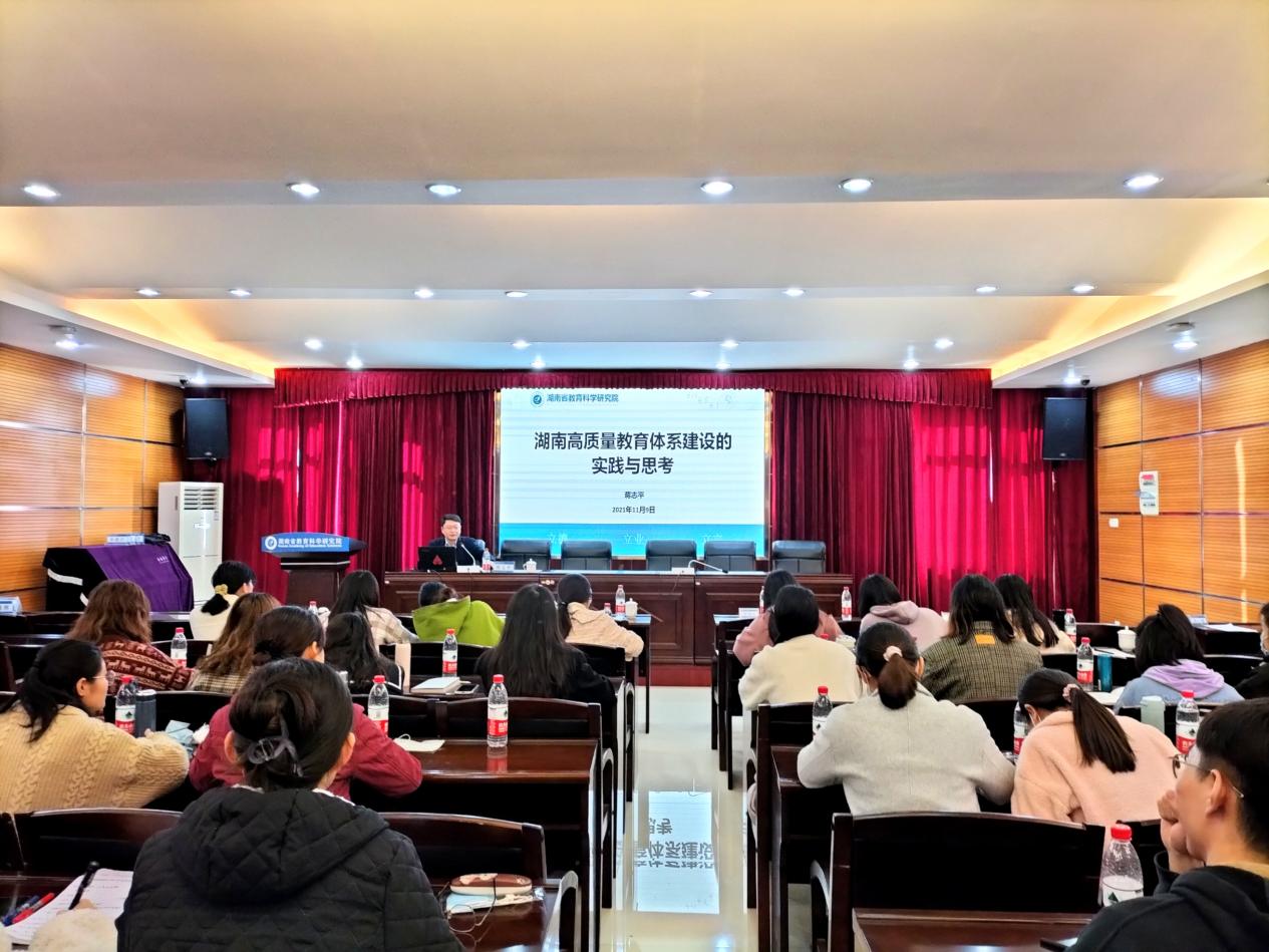 蒋志平作“湖南高质量教育体系建设的实践与思考”的专题报告。他分享了参与《湖南省国民经济和社会发展第十四个五年规划和二〇三五年远景目标纲要》编写的经历,沿着“回顾奋斗‘十三五’的五年跨越”“俯瞰新时代湖南教育的发展形势”“展望奋进‘十四五’”的脉络展开,全面回顾了党的领导下湖南省教育现代化体系的形成历程,指出当前世界教育竞争日趋激烈,我国教育进入高质量发展新阶段,教育的特征、对象、需求和服务呈现出新特点。具体到湖南,现代化新湖南建设呼唤现代化教育支撑,面对新挑战,应重点聚焦“三项任务”——立德树人、各级各类教育发展、教育领域综合改革,着力提升“两个能力”——要素保障、教育服务区域发展,始终强化“一个根本保障”——党的领导,促进湖南教育事业转型进入高质量发展新阶段。此外,他还就普职融合、编外教师、研究生教育布局、区域义务教育共同体等问题同在座同学进行了交流。