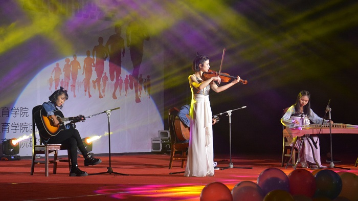 校园那么大,带你来看看。晚会的开始,一首《去科大旅行》牵动了所有科大师生的心绪,现场观众瞬间融入了晚会热烈的氛围之中。接下来婀娜多姿的傣族舞蹈登上舞台,像水一般纯净的傣家女儿,带领观众走入傣族舞梦幻意境。小品《教院好新闻》,通过演员正经而不失诙谐的表演,展现了科大校园大大小小妙趣横生的事情,现场观众连连捧腹大笑,晚会热闹的气氛不断高涨。器乐表演《MIX》通过音乐来唤起科大师生心灵的共鸣,小提琴,吉他以及古筝等乐器演奏的优美旋律萦绕在耳旁,使人沉醉在这样的听觉盛宴中无法自拔。现场还设置了微信互动抽奖环节,在奖品的诱惑下,大家更是积极参与。抽奖过后,研究生舞蹈《Gashina》性感热辣,舞姿曼妙,叫好声连连,掌声不断。下一个声乐串烧《没有你的地方都是流浪》,歌声嘹亮,颤动心房,欢呼声不断。话剧《致敬》完美结合了现代因素,以穿越的形式展现了抗日年代革命先辈的流血牺牲,致敬先辈,珍惜和平。随后,一场绝无仅有,引人入胜的走秀表演来袭,台上的他们自信张扬,昂首阔步,走出了科大人的风采!舞台上的爵士舞《Super Hero》,原始、热情、奔放、急促又富有动感和节奏,给现场观众带来了一场视觉盛宴。教官歌曲《再见》带我们回忆起军训的点点滴滴,那时候咬牙坚持的台阶军姿,那时候讨厌的俯卧撑,那时候一起唱过的军歌,我们不要告别,我们不说再见。又一首《三天三夜》来袭,加入研究生的行列,狂欢三天三夜,激情澎湃。
