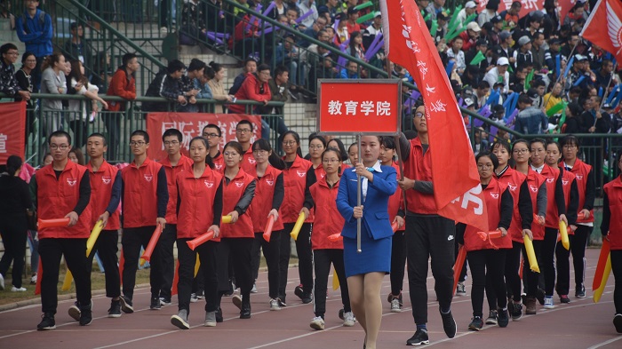 彩旗飘飘,身姿挺拔,步伐整齐,服装统一,彩旗队、鲜花队等一一走过主席台。随后yl88858永利集团方阵队正式入场,一身黑色着装深沉帅气、红色马甲引人注目,他们手举打击棒,高呼着“学高为师,身正为范,教院骄子,勇争桂冠”的口号。响彻云霄的声音和整齐划一的动作赢得了全校学生的目光,鲜衣怒马,少年意气。紧随其后的是yl88858永利集团的教师团队,青春的着装向同学展现出了学院教师们永不过时的思想,出来半生,他们仍是少年。