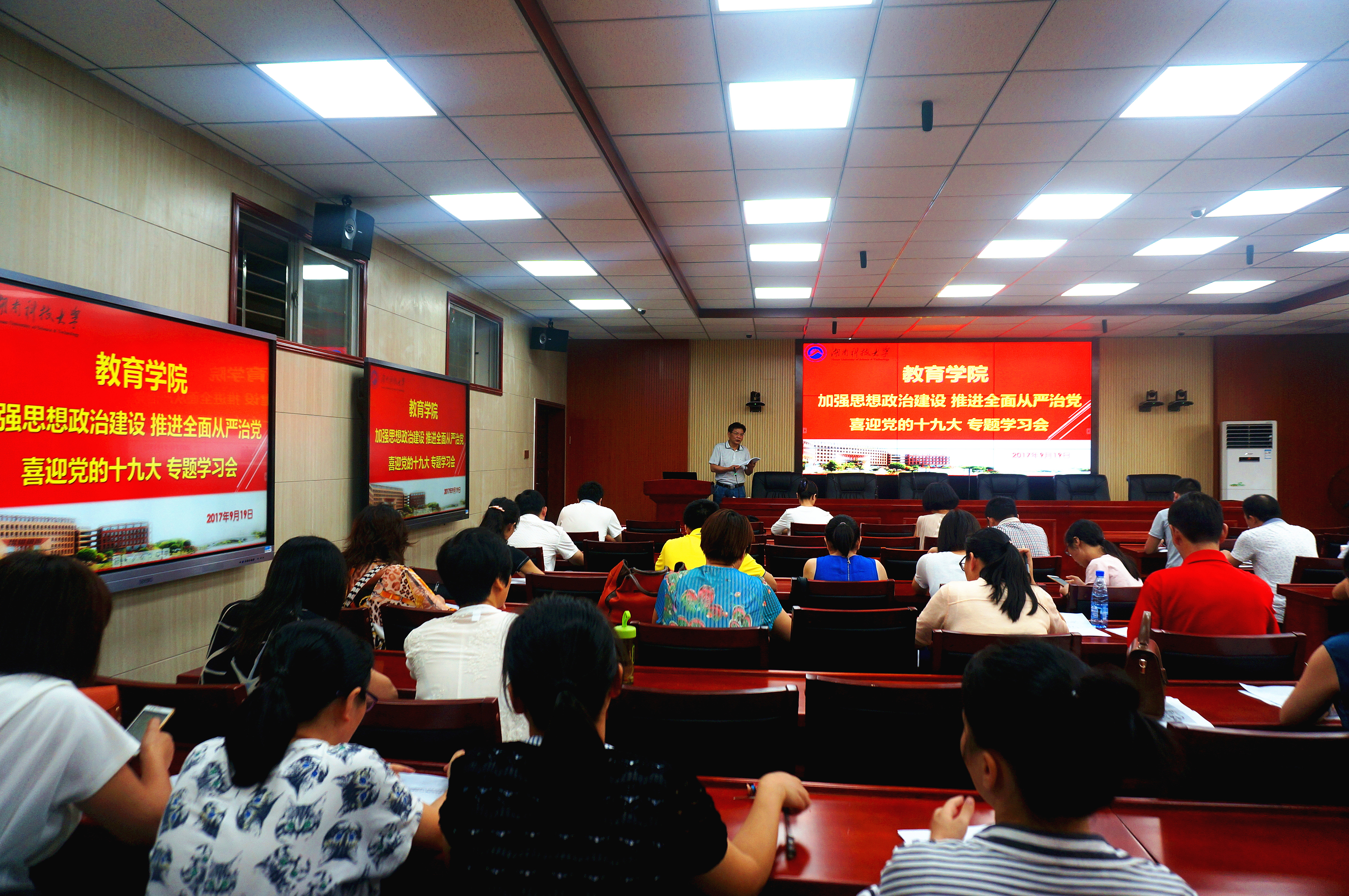 2017年9月19日下午,yl88858永利集团在八教304会议室召开“加强思想政治建设 推进全面从严治党 喜迎党的十九大”专题学习研讨,研讨会由党委书记李炳煌主持,全院教职工参加,会上对加强理论知识学习、切实开展高校思想政治工作进行了学习研讨,号召全体教职工积极做贡献,创佳绩,喜迎党的十九大召开。