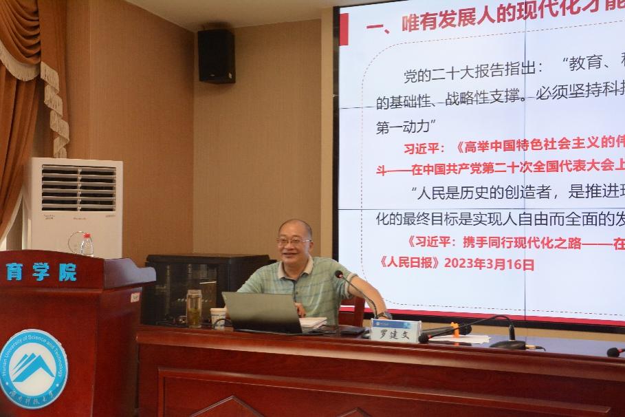 18日下午,湖南科技大学马克思主义学院罗建文教授为书记校长班带来题为《中国式教育现代化的根本任务就是实现人的现代化》的学术讲座。他提到唯有发展人的现代化才能真正实现教育现代化,努力造就符合中国式现代化本质要求的高素质人才,全社会要形成一种不拘一格培养人才的良好氛围。
