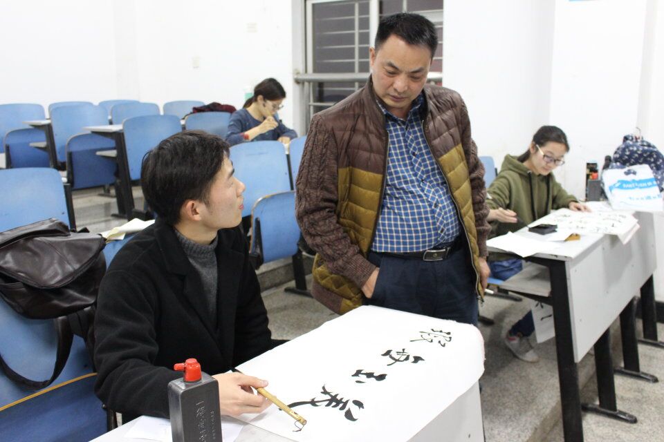 20:30,紧张的比赛接近尾声,所有选手陆续完成作品。傅老师更是兴致盎然,现场提了两幅字赠予学生。此次参赛作品中,不乏行云流水之行书、蚕头燕尾之隶书,也有娟秀工整的楷书。现场打分的评委老师忙得不亦乐乎,时而对选手的惊喜之作频频点头,时而相互低语交流感想。21:00,比赛结果也在工作人员有条不紊的统计下即刻出炉:毛笔字共产生2个一等奖、2个二等奖、3个三等奖;钢笔字共产生6个一等奖、6个二等奖、12个三等奖;粉笔字共产生3个一等奖、4个二等奖、4个三等奖。本次大赛顺利完成,落下帷幕。