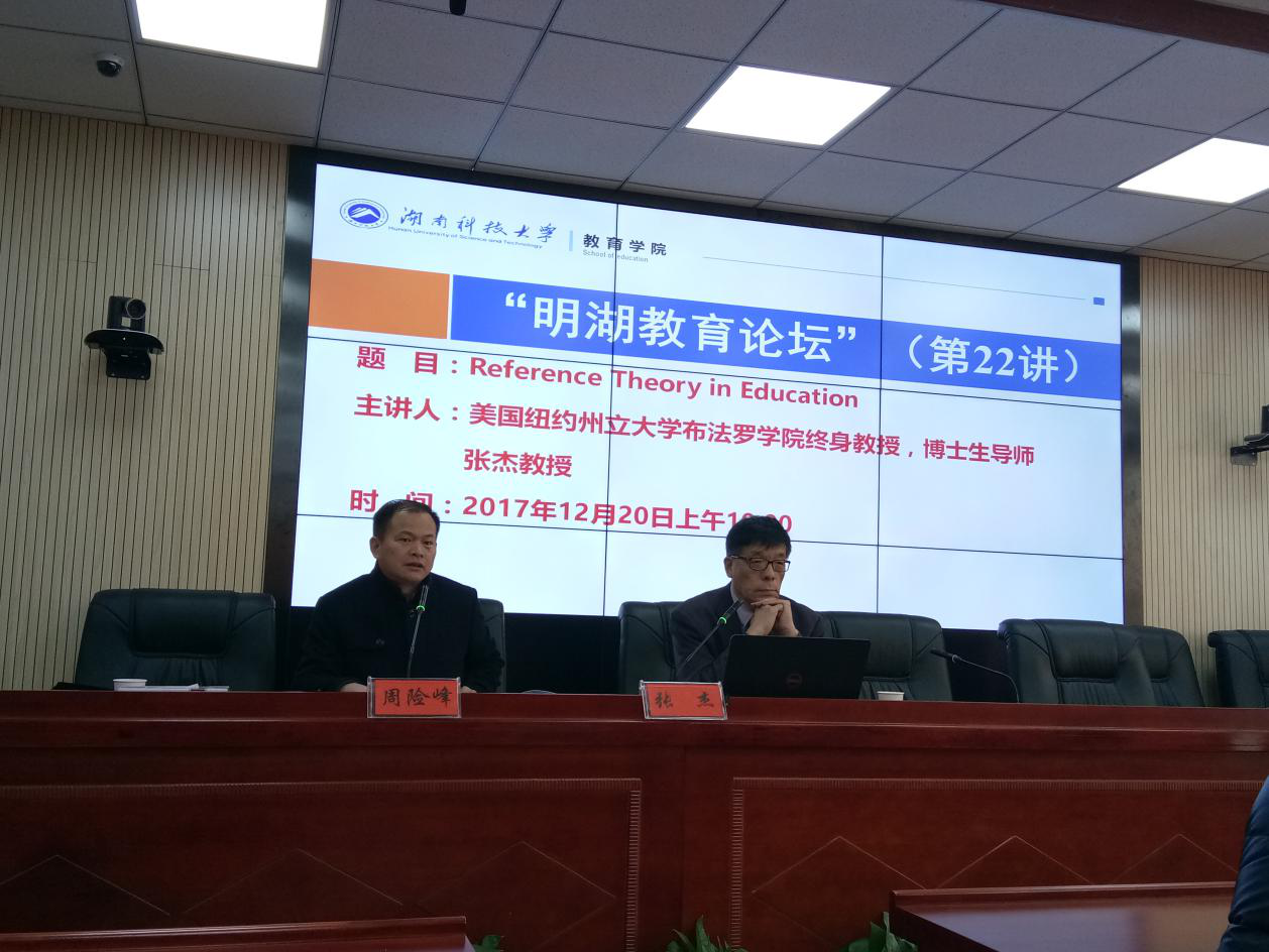 2017年12月20日上午,美国纽约州立大学布法罗学院终身教授、博士生导师张杰教授做客“明湖教育论坛”,在八教三楼报告厅为我院师生带来了题为《Reference Theory in Education》的学术讲座,yl88858永利集团研究生代表、教师代表到场聆听。讲座由教育科学研究院专职副院长周险峰主持。