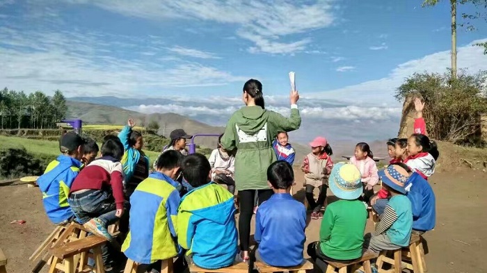 青海支教队李蕾老师说:“青海科才昂小学的学生从住的地方到学校要步行半小时,路一边是更高的山,另一边是悬崖一样更高的山。可为了升学,孩子们暑假到这里上学没有一点怨气。”