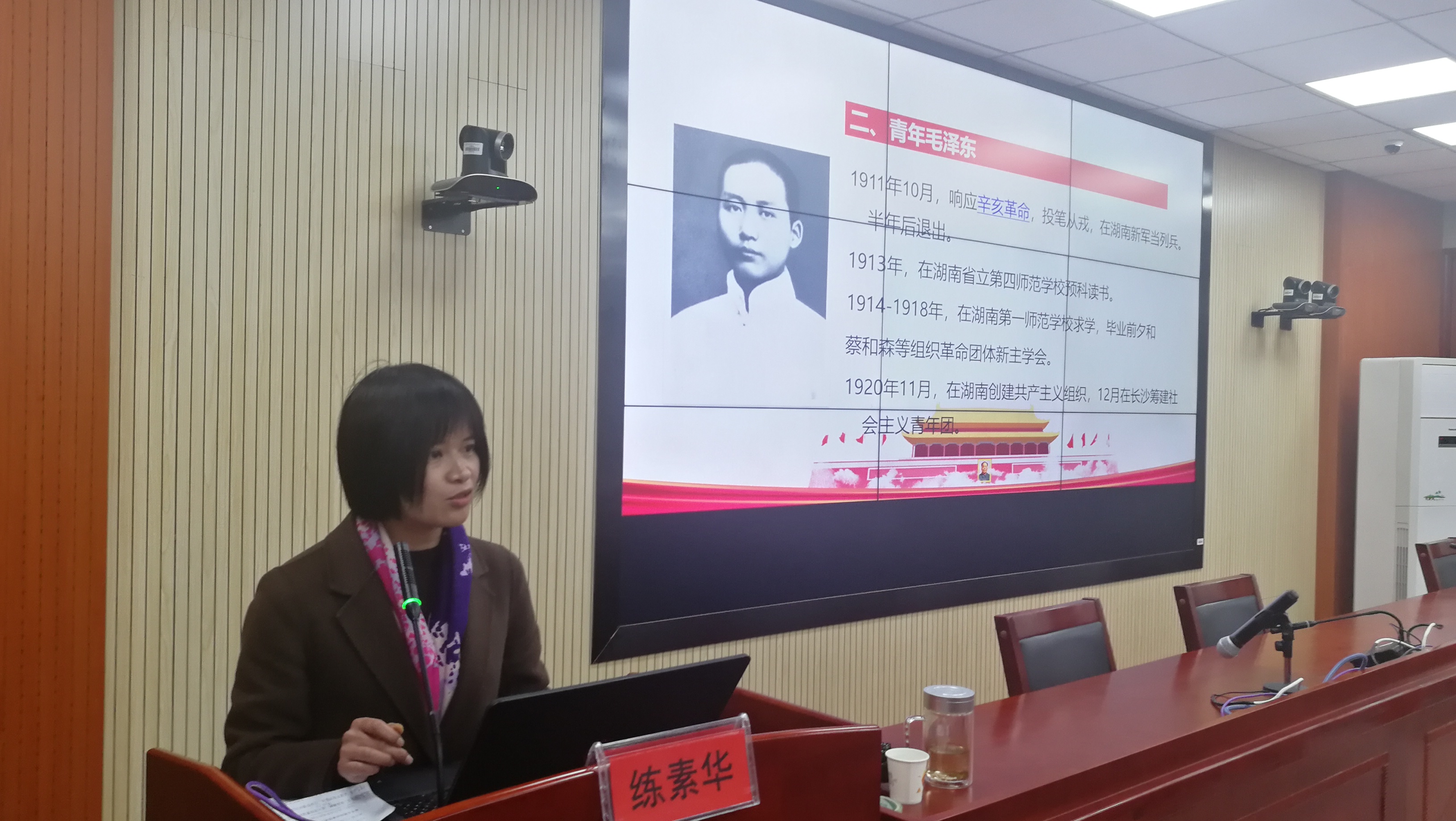 练素华首先对在场同学关于毛主席的生日进行提问,借此强调今年是纪念毛主席诞辰125周年,并介绍了伟人诞生地——韶山。之后,她从求学历程、创办《湘江评论》等几个方面为我们讲述了青年毛泽东的人生经历,鼓励我们都要以毛主席为榜样,刻苦学习,积极进取。除此之外,练素华还对毛主席身上的五种可贵精神进行解读,如严谨刻苦的求学精神和科学深入的实践精神等,同学们从中感受到了毛主席的榜样力量并积极学习。最后,她带领我们一起回顾毛主席的十大丰功伟绩,以纪录片《1959年毛泽东回韶山》为这一主题画上完美的句号!