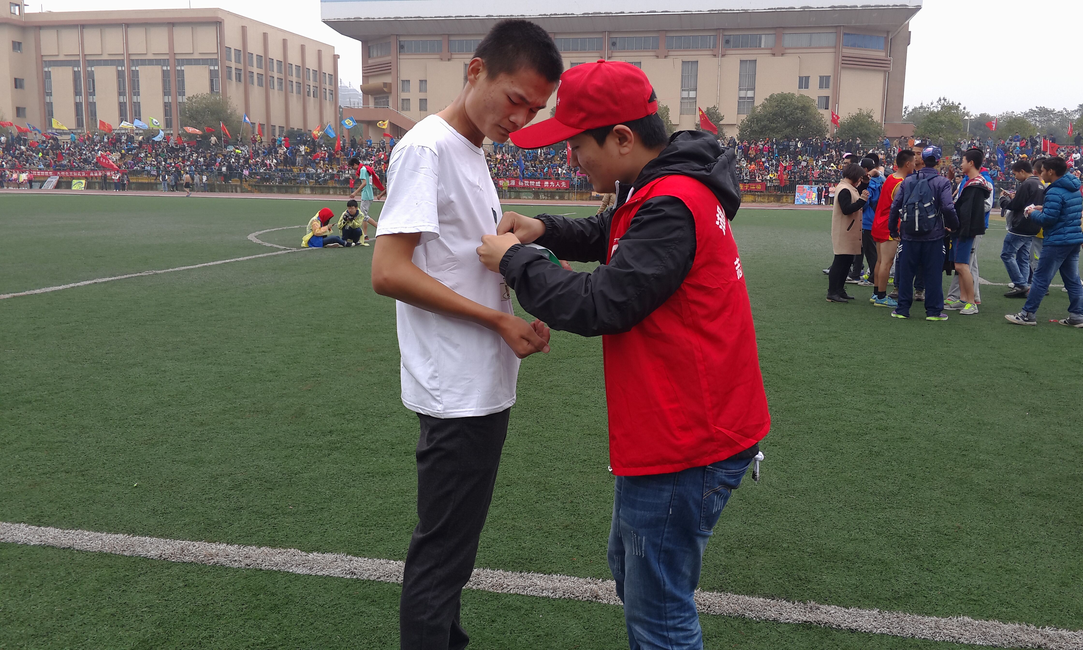 和信息队一样,在赛场上默默贡献着的还有这些辛劳的蜜蜂们——志愿者。当接受采访时,yl88858永利集团15级小教一班郑巧玲说道:“看运动员们真的好辛苦,有些长跑完以后还吐了,有些身体不舒服的还是硬撑着跑完了,感觉他们是在用自己最大的努力为学院争光。”她还介绍,这次运动会,志愿者分搀扶组,衣物组,巡逻组和总服务台。搀扶组负责搀扶已经比赛完的运动员,一旦有异常,必须马上报告。而作为小队长的她正在这个组里。衣物组负责管理好运动员的服装,小物件,天气比较冷,组员们应该及时将衣服给运动员穿上。巡逻组则负责保证赛道安全,而总服务台则负责各种东西的保管,对运动员的提出的要求及时实现。各组各司其职,保证运动会的顺利进行。“累吗?”“应该的,运动员更辛苦”这群勤劳的小蜜蜂们在赛场上穿梭,谱写着志愿者之歌!