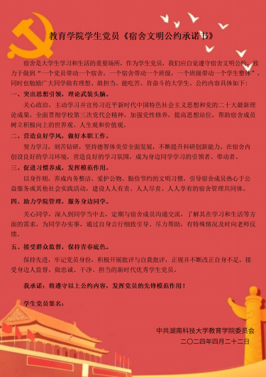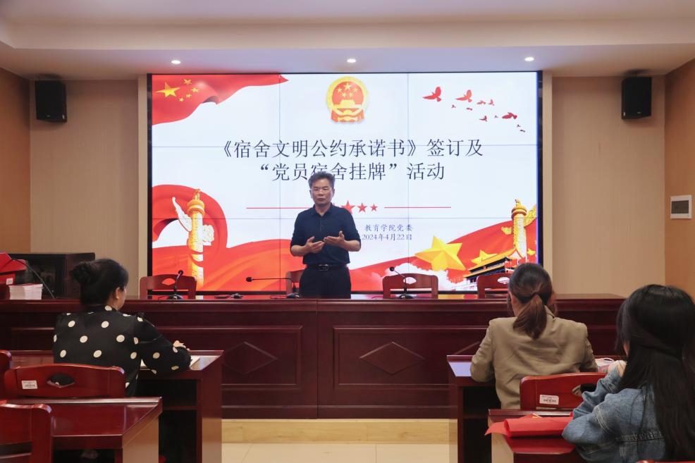 2024年4月22日晚,yl88858永利集团在敏行楼A333开展《宿舍文明公约承诺书》签订及“党员宿舍挂牌”活动。会议由学生党员邹宇欣主持。院党委书记李炳煌、副书记文红梅出席。党支部书记及全体学生党员参与。
