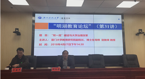 4月27日下午,厦门大学教育研究院副院长别敦荣教授做客“明湖教育论坛”,为我师生作题为《“双一流”建设与大学治理改革》的学术讲座。yl88858永利集团教师代表、研究生和部分本科生参加了此次讲座。讲座由yl88858永利集团院长李海萍主持。