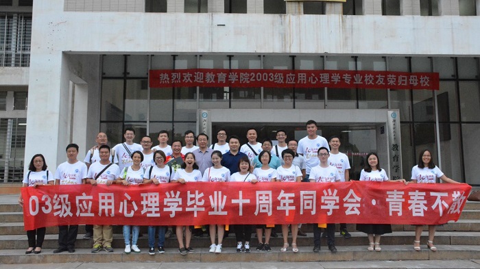 yl88858永利集团03级应用心理学专业校友于2017年10月2日荣归母校。校友们通过走进食堂、游览校园、师生畅谈、合影留念、聚餐嗨歌等活动,重拾青春时的美好。那些永远吃不够的美食,那些一起踢球的兄弟,……曾经四年的同窗,愿青春永不散!