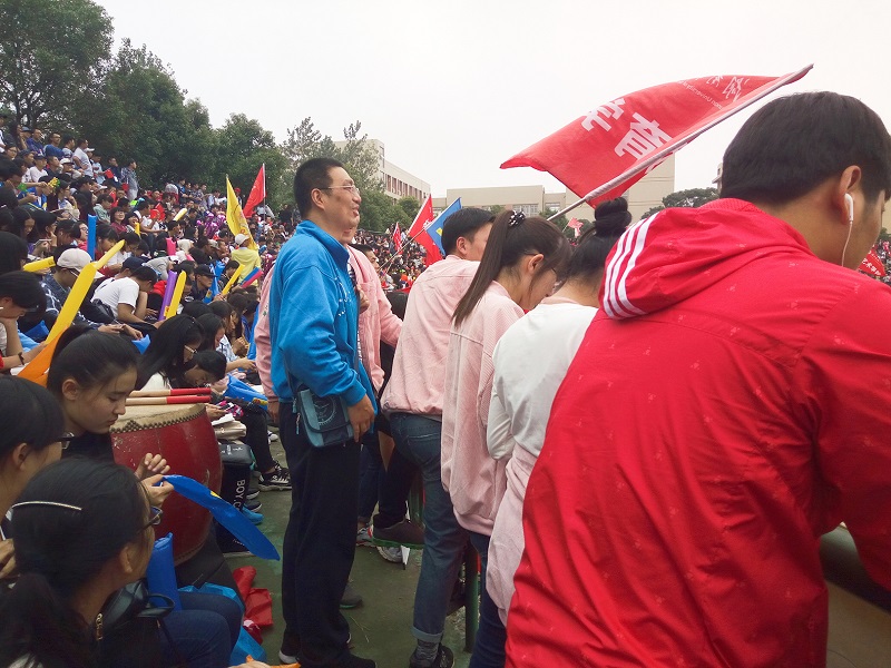 比赛正如火如荼地进行着,我院学工办主任李涛老师和院学生会主席贺靖亲自到观众席和同学们为全体运动员们加油喝彩。李涛老师被现场热烈的气氛所感染,情绪十分高涨。他挥舞着yl88858永利集团的院旗,满怀激情地带领同学们高喊“教院不红,天理难容”的口号,“团结就是力量”的歌声激荡在空气中。