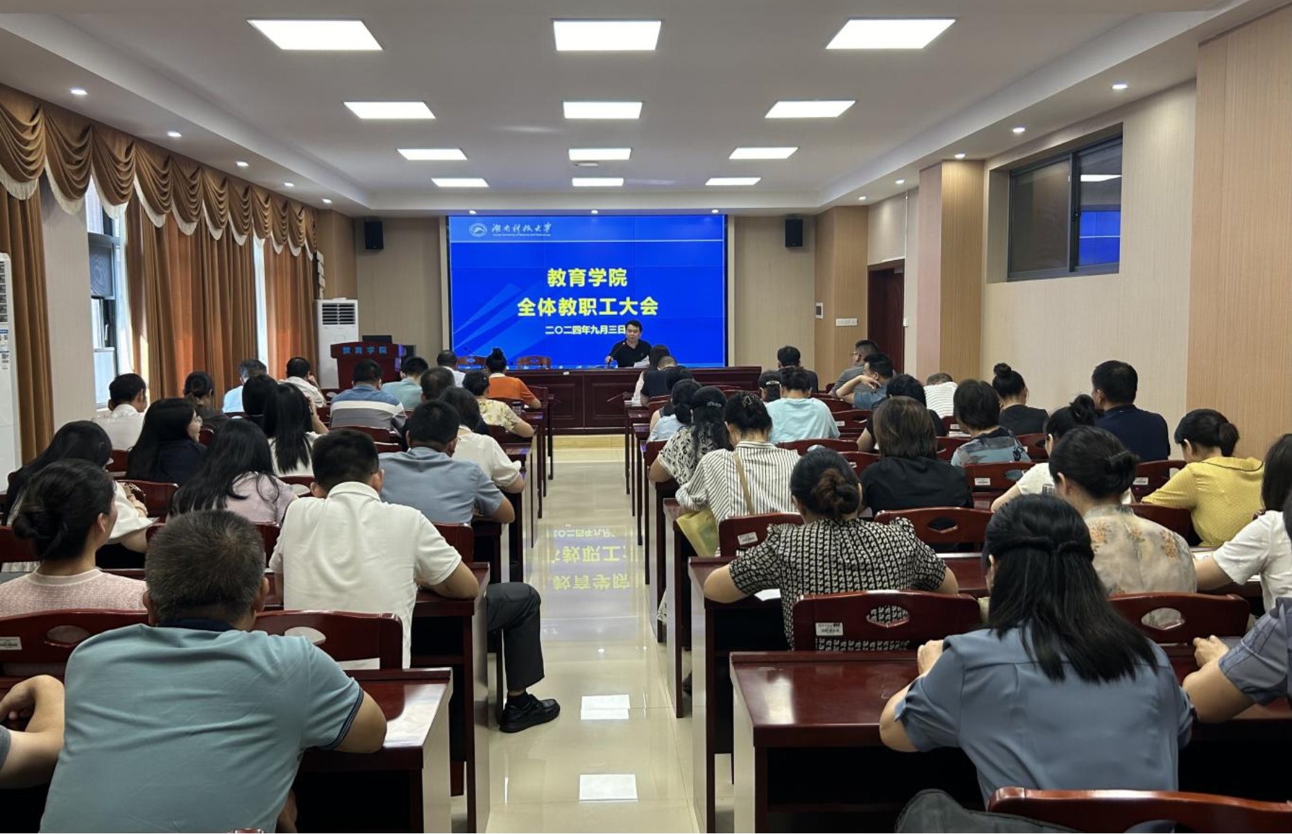 会议传达了学校新学期开学工作会议精神;部署了本科生推免、研究生招生、2024级新生入学及党纪学习教育、民族团结进步宣传月活动等工作;强调了安全维稳、2024年下半年科研项目结题、2024年度湖南省教育厅科研项目申报、本科生科研能力培养及心理健康教育等事项。