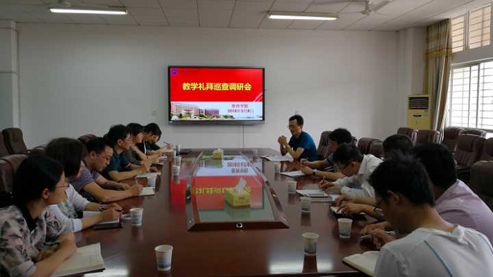 会上,学工处处长尹风雨就此次调研的内容作了解读,并要求辅导员下班级组织开好此次教学礼拜主题班会,树典型、促班风、促学风,将班会主题内容落地、生根、发芽。随后招就处处长蒋利平对我院各专业的就业情况进行通报,并在促进学生就业和调整专业生源计划方面提出建议。院党委副书记刘辉亚就此次调研内容从学风建设、日常管理、心理健康和就业等方面工作的开展情况、存在问题及下一步工作计划作了汇报。院党委书记李炳煌介绍了我院的总体情况,详细阐述了学院的教务与学工工作联动情况,并和巡查调研组一起探讨如何从教与学两方面来改善学生学习风气,提高学生的学习积极性。