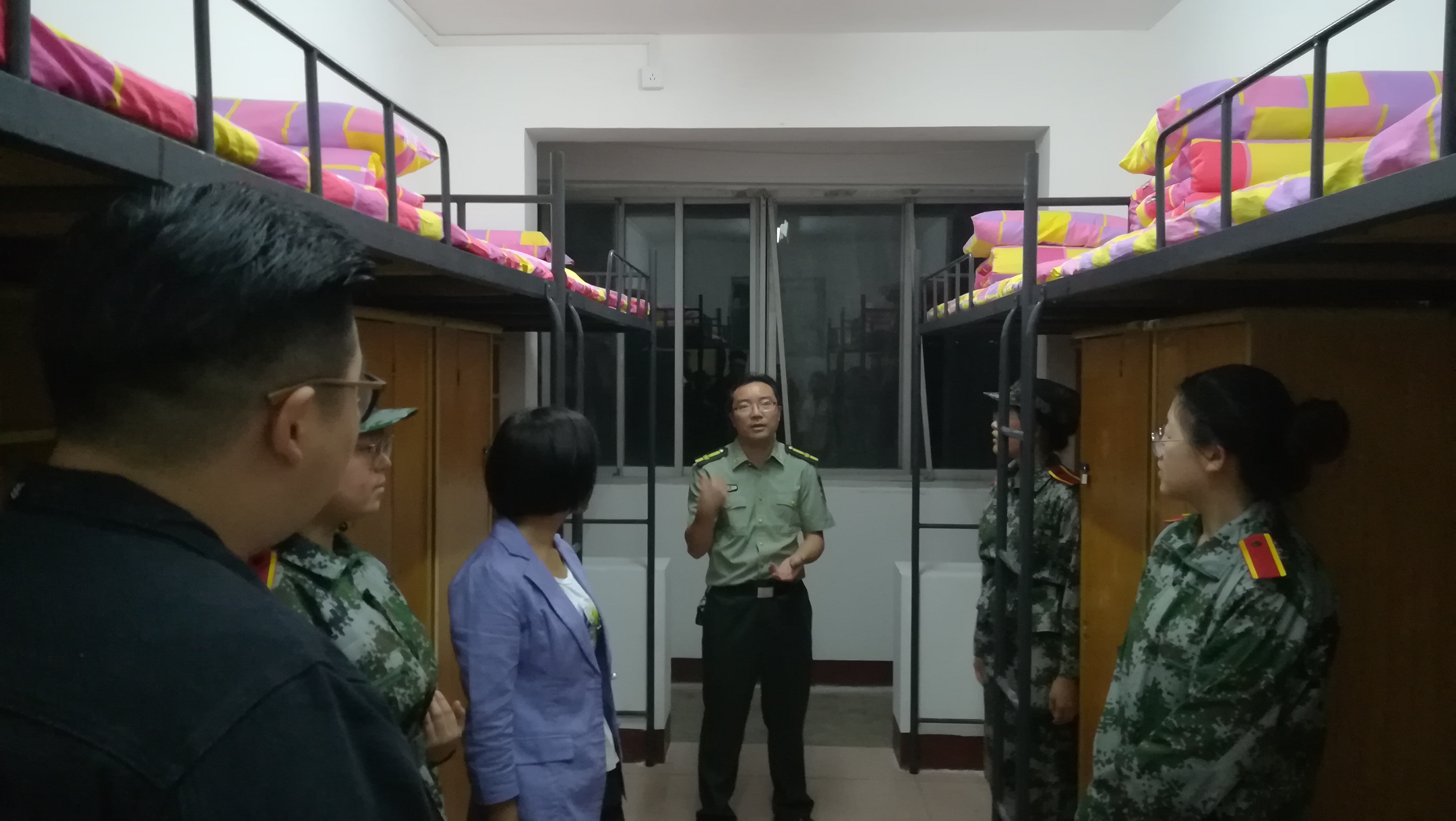4日下午,yl88858永利集团党委书记李炳煌、副书记刘辉亚亲临训练现场查看同学们的训练情况,并提醒同学们要注意安全,训练时要注意身体,防止中暑,训练的强度要合适,要进一步加强训练,将训练内容落到实处。晚上,新生在寝室整理内务,认真叠方块被子的时候,院党委副书记刘辉亚和18级辅导员练素华老师来到新生宿舍,查看内务整理情况,并细心指导新生整理内务,让新生备感温暖。