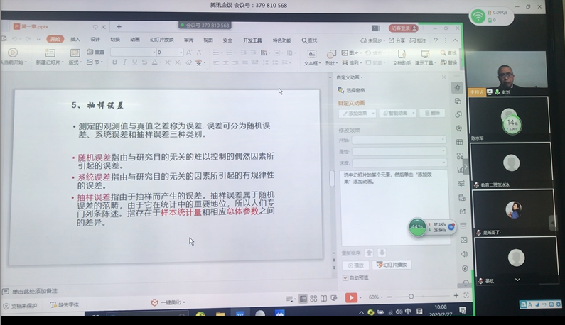 2月27日上午10时,教务处周智华处长、余光辉副处长、尹利平主任来我院进行疫情防控期间线上教学工作情况调研,并在八教208会议室实时观看了刘成伟老师在“腾讯会议”平台进行的《教育统计与测量》视频互动课。