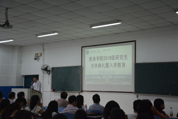 2016年9月1日下午,yl88858永利集团2016级研究生开学典礼在八教2-3隆重举行。yl88858永利集团院长李海萍教授、党委书记谭建平教授、副院长陈坤华教授、院党委副书记王伟清教授、各方向负责人及部分研究生导师出席了本次典礼。典礼由院党委书记谭建平教授主持。