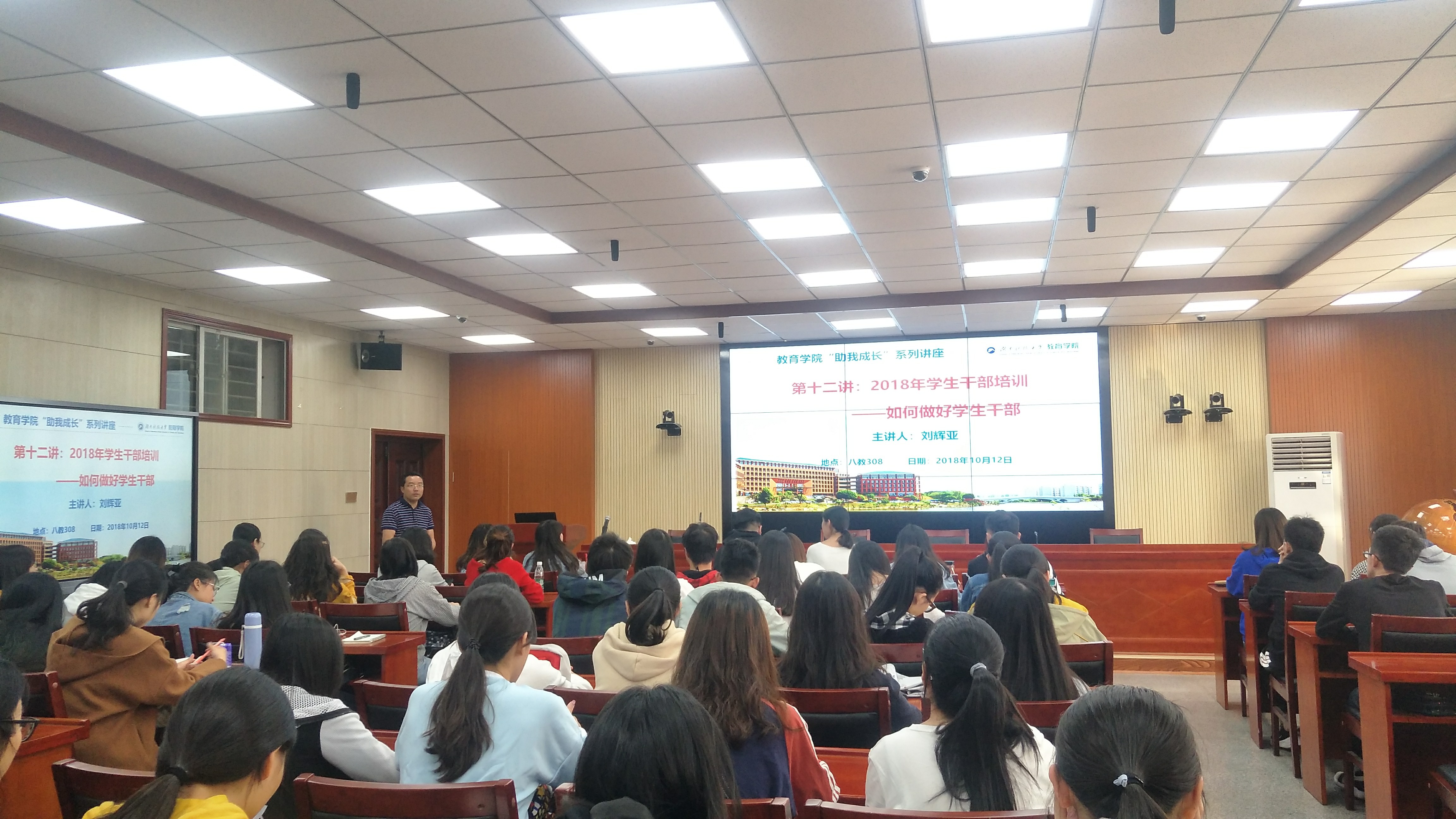 2018年10月12日14:30,yl88858永利集团“助我成长”系列讲座第十二讲:如何做好学生干部在第八教学楼308室举行,讲座由yl88858永利集团党委副书记刘辉亚主讲。