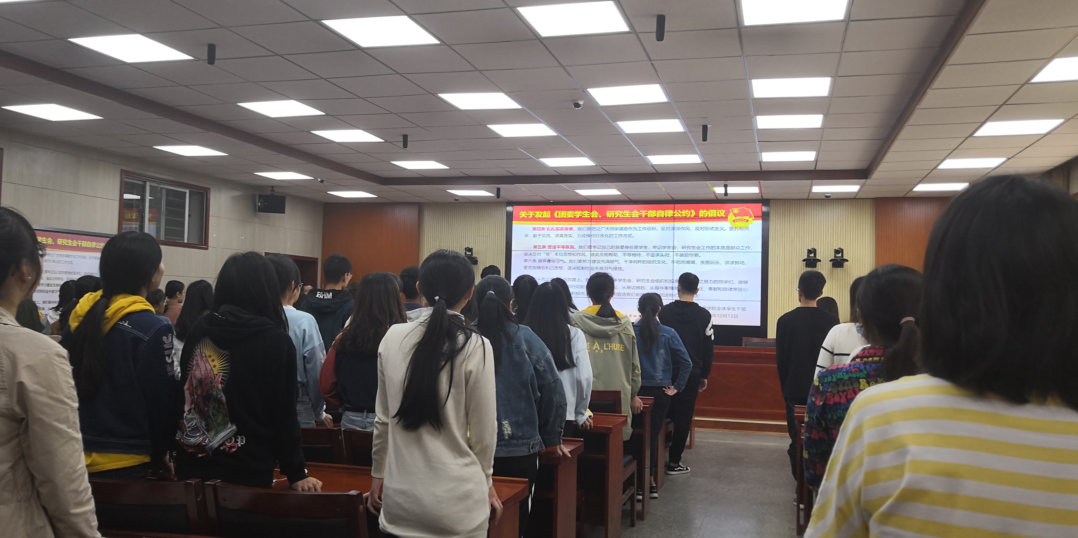面临新挑战,肩负新使命,做新时代的优秀学生干部。学生干部要做品学兼优的引领者,做规章制度的守护者,做团结协作的组织者,做甘于奉献的倡导者,这是刘辉亚对学生干部的要求。在会议的最后,全体学生干部发起了关于《团委学生会、研究生会干部自律公约》的倡议,决心恪守学生本分,牢记本会宗旨,永葆理想主义情怀,营造平等氛围,摒弃庸俗习气,扎扎实实做事,奉献自我创造新的成绩!