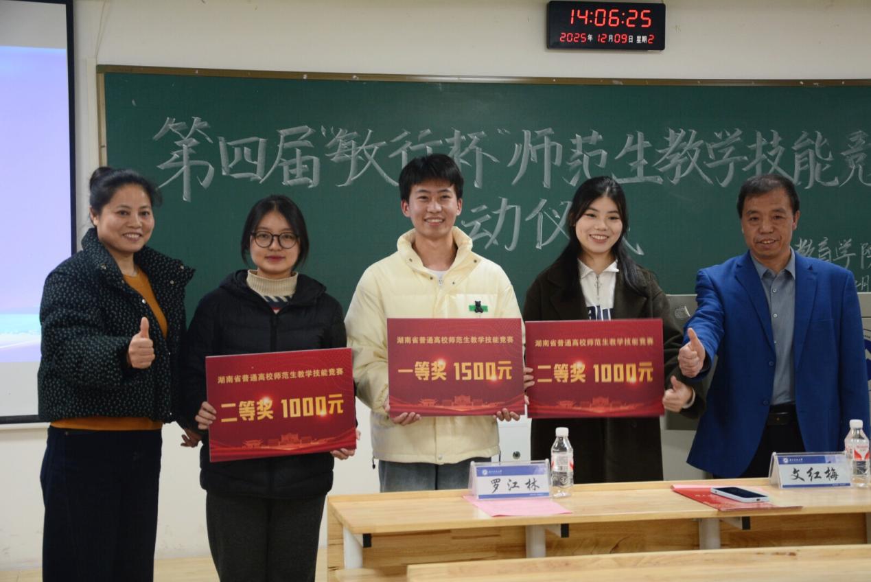 文红梅宣读湖南省第十一届师范生教学技能竞赛获奖名单、第十一届湖南科技大学师范生教学技能竞赛“十佳选手”名单。张进良、文红梅共同为获奖选手颁发证书及奖金。