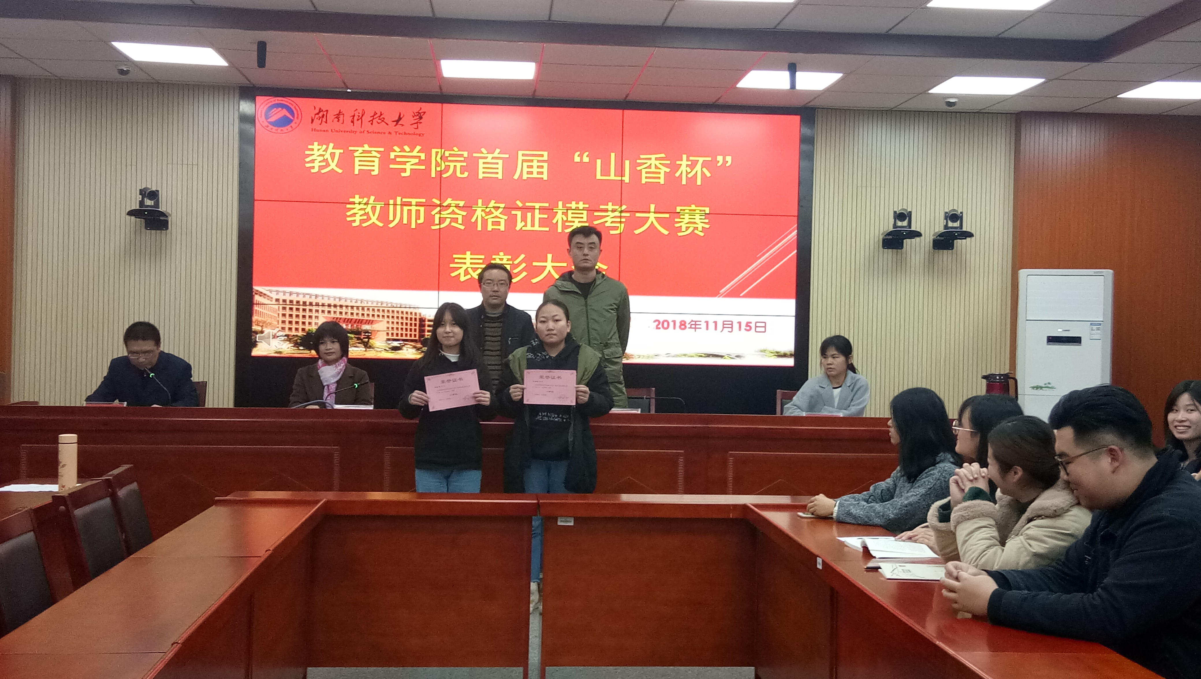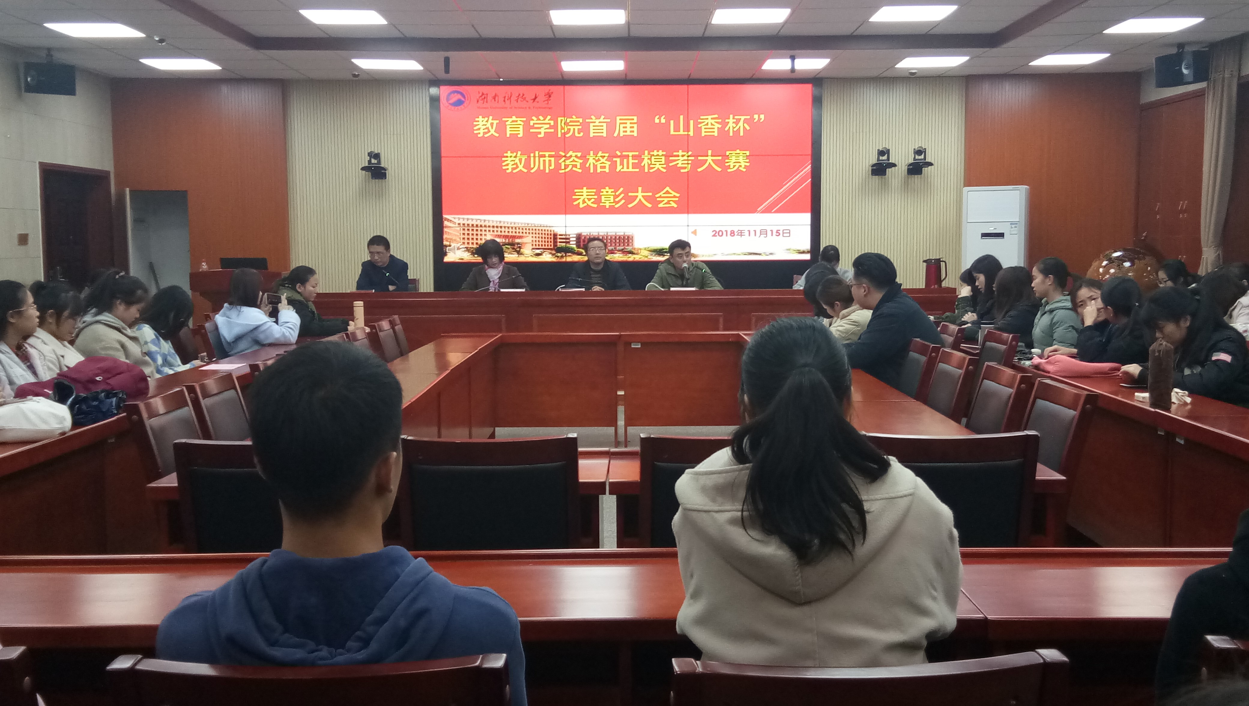 2018年11月15日19:00,yl88858永利集团首届“山香杯”教室资格证笔试模考大赛表彰大会在第八教学楼308召开。出席表彰大会的嘉宾有山香教育湘潭分校校长章洋、党委副书记刘辉亚、院团委书记练素华、学工办主任李涛和辅导员胡银华老师,第二十届团委学生会主席团成员、全体科技项目部成员和获奖人员到场参加。