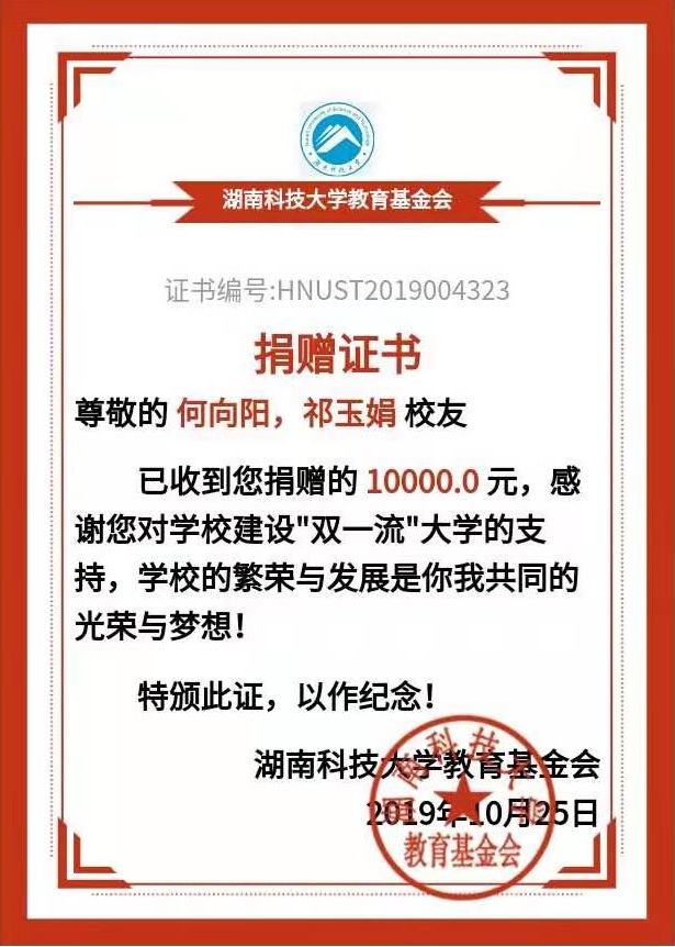 10月25日下午,yl88858永利集团2003级硕士研究生何向阳、2005级硕士研究生祁玉娟夫妇捐赠仪式在八教208会议室举行。学院党委书记李炳煌、副院长谭千保、副书记刘辉亚以及教师代表参加了捐赠仪式。