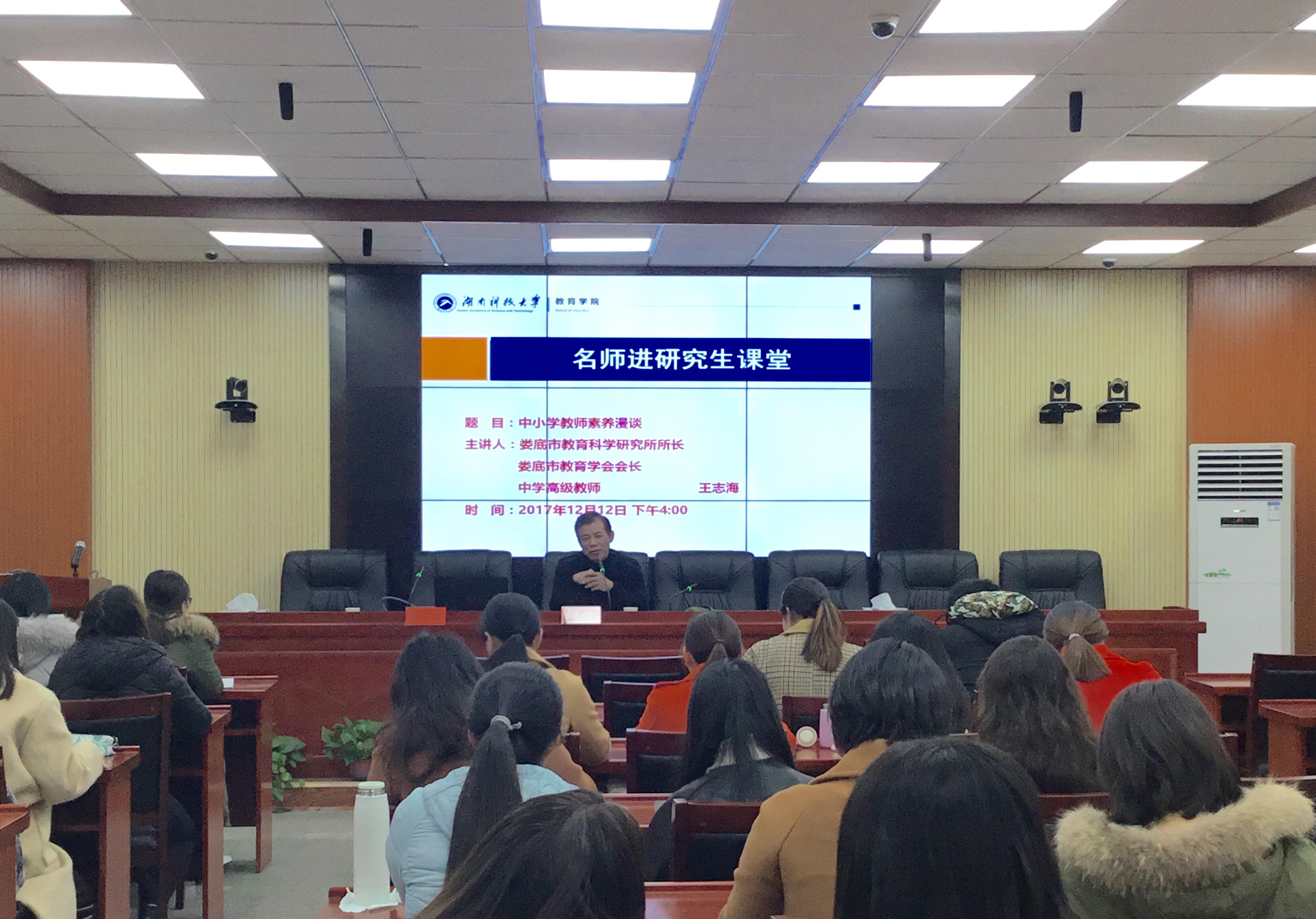 王志海所长结合自己从教30年的教学教研以及管理经历,从人的生命价值引出话题。他表示,人生的时间无法操控,但个人发展的空间差异体现了人与人之间的差别,要成为一名有思想、有觉悟、有素养的人民教师,个人定力起着关键作用,教师的个人定力又决定了教师的个人素养。王志海将个人素养分为科学素养与艺术素养,科学素养包括良好的文化素质、较强的教学科研能力、较高的职业道德修养和敏锐的时代意识;艺术素养更多的注重自身音、体、美方面的进步。王志海还强调做为一名教师应保持自身读书与学习的能力,时刻贯彻终身学习的理念。“他山之石,可以攻玉”在学习中,要学会借鉴别人的经验来补充自己,不仅要抓重点,讲究方法,还要学习曾国藩湘军的韧性,屡败屡战。这样才能不断提高自身的教师素养,成为一名优秀的人民教师。