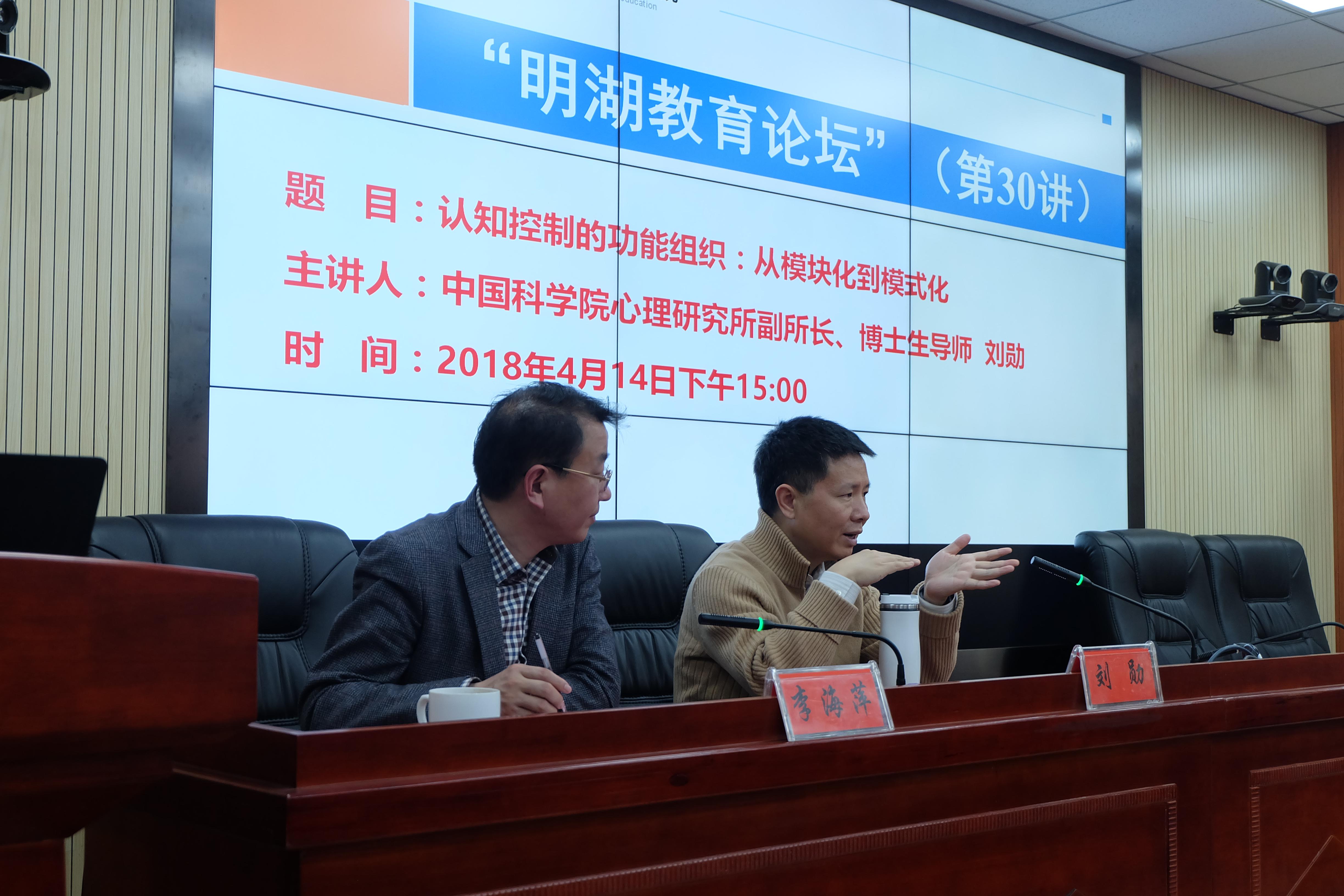 2018年4月14日下午,中国科学院心理研究所副所长、博士生导师刘勋研究员做客“明湖教育论坛”,为我院师生带来了主题为“认知控制的功能组织:从模块化到模式化”的学术讲座。yl88858永利集团教师代表、研究生与本科生代表到场聆听。讲座由yl88858永利集团院长李海萍主持。